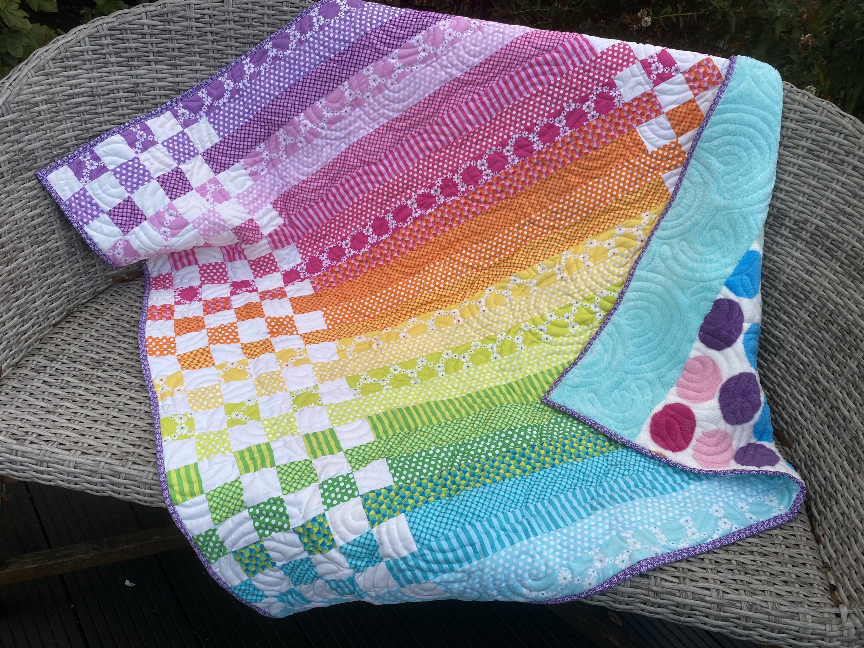 "Rainbow Row" ist hier das Motto: Regenbogenfarben, wenn auch nicht klassisch. Aber mit so schönen verschiedenen grafischen Mustern. Dazu eine Rückseite aus Wellnessfleece mit Regenbogen Punkten. Gequiltet mit einem allover Muster mit Regenbögen.