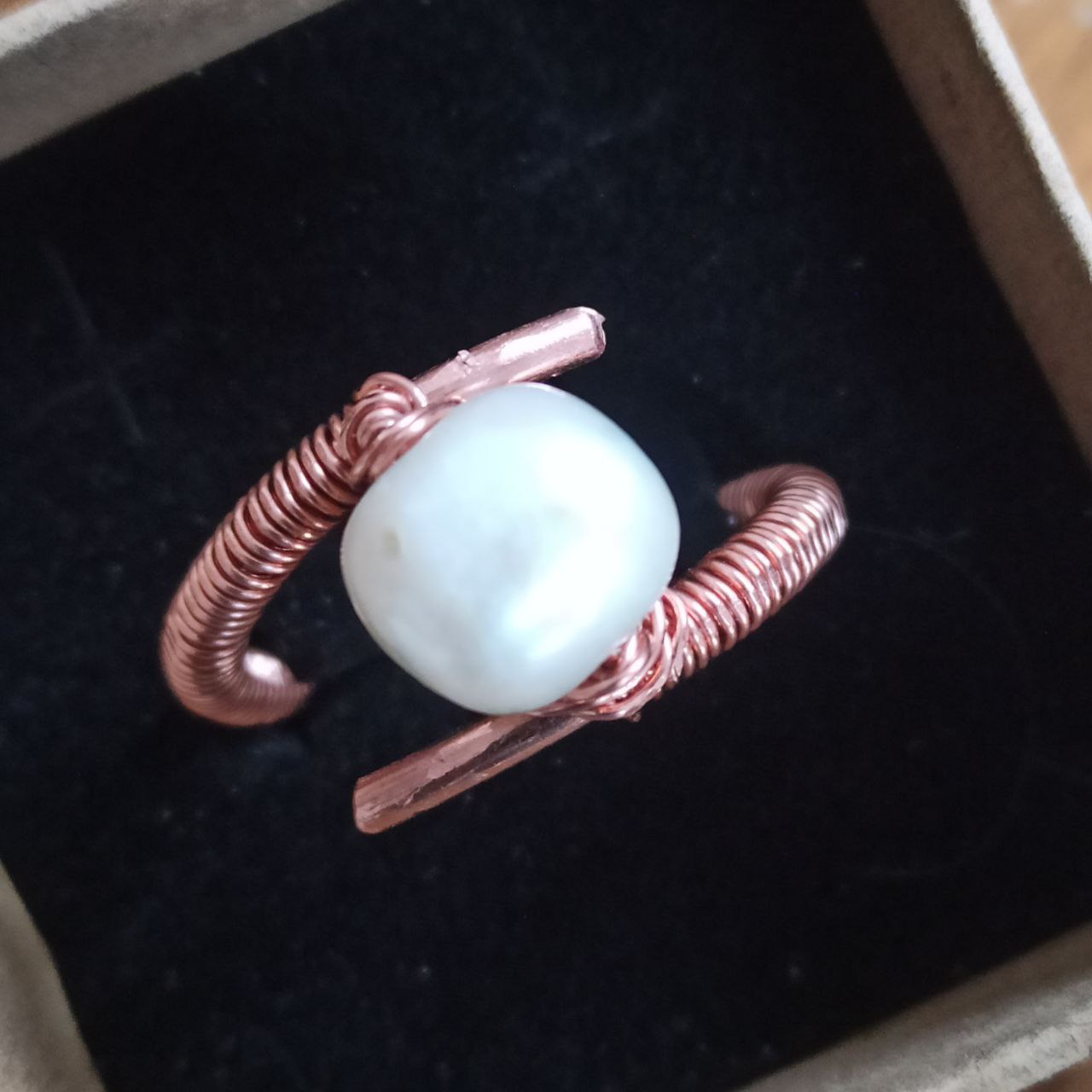 Dieses hier ist der Ring mit Perle. Ich freue mich sehr über die schöne Möglichkeit, diesen Schmuck herstellen zu können. Nur mit Wickeln und biegen und hämmern.