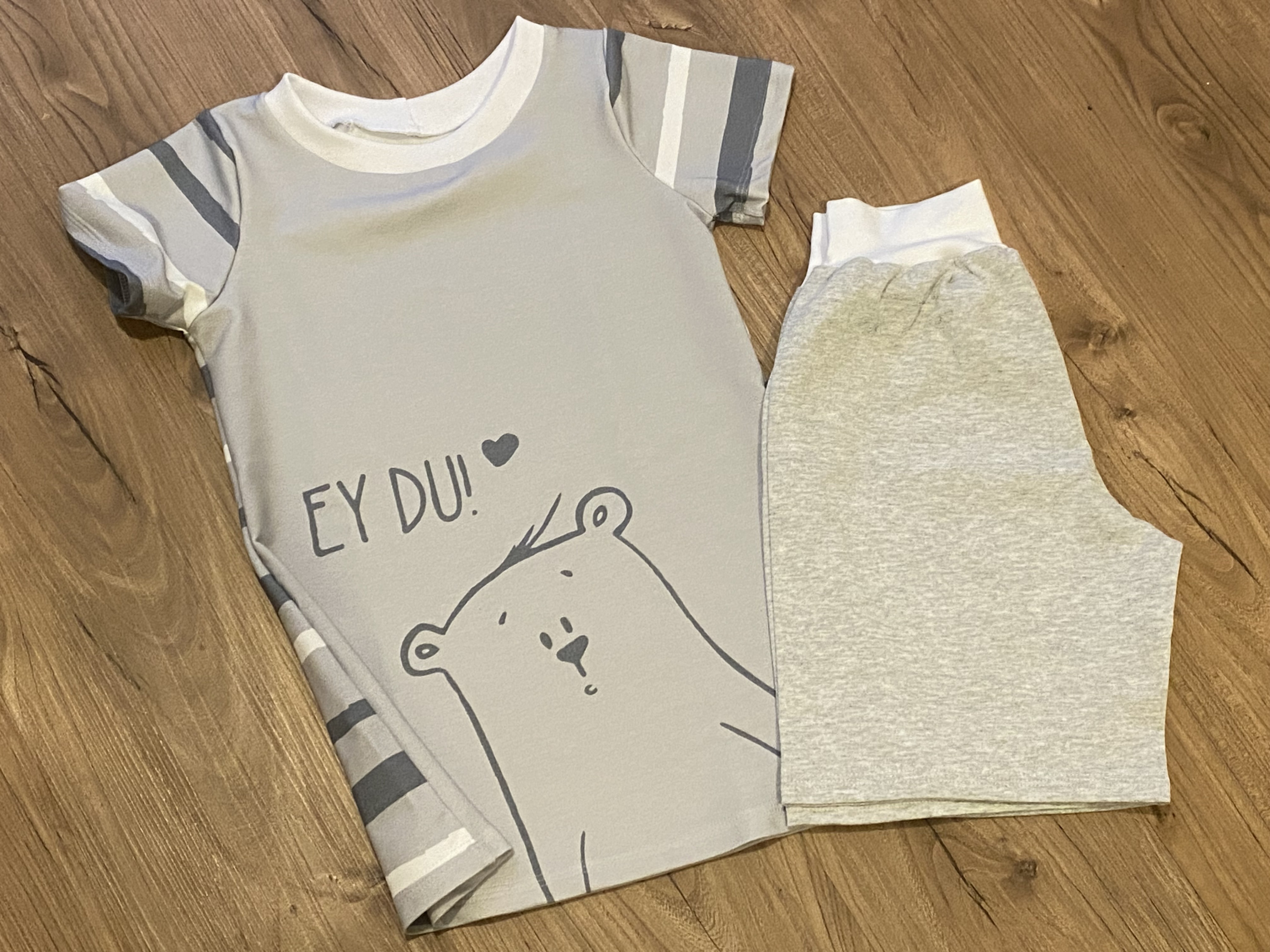 Das Oberteil ist aus einem Panel genäht, die Hose ist Upcycling aus einem neuen Herrenshirt, dass die Stickmaschine gefressen hatte - für die Hose perfekt.