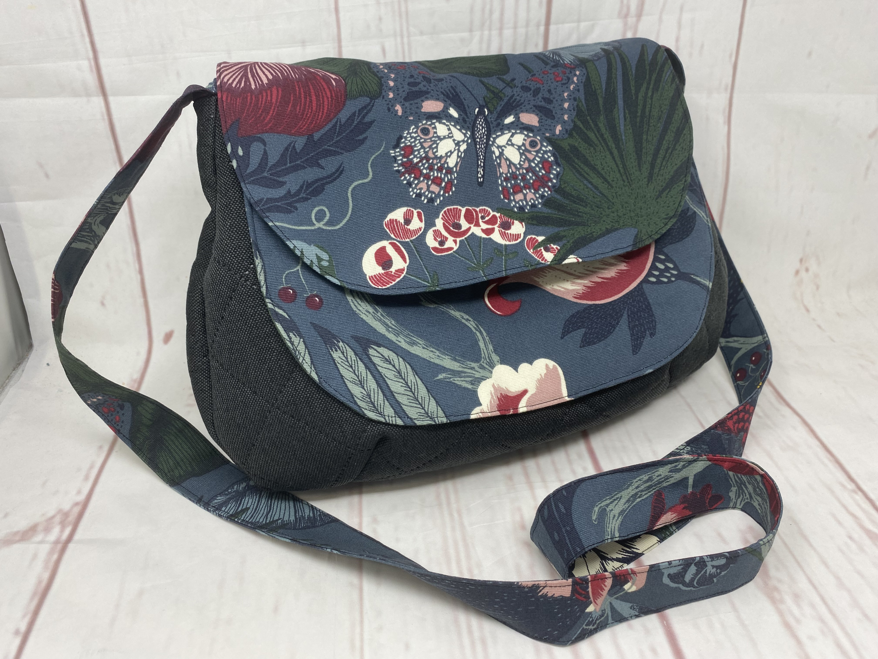 Innen mit Extrafach mit Reißverschluss und aus dem gleichen Stoff wie Träger und Klappen. Die Klappen können - wie bei dem Schnitt ja gedacht - in beide Richtungen getragen werden und auf beiden sind unterschiedliche Schmetterlinge.