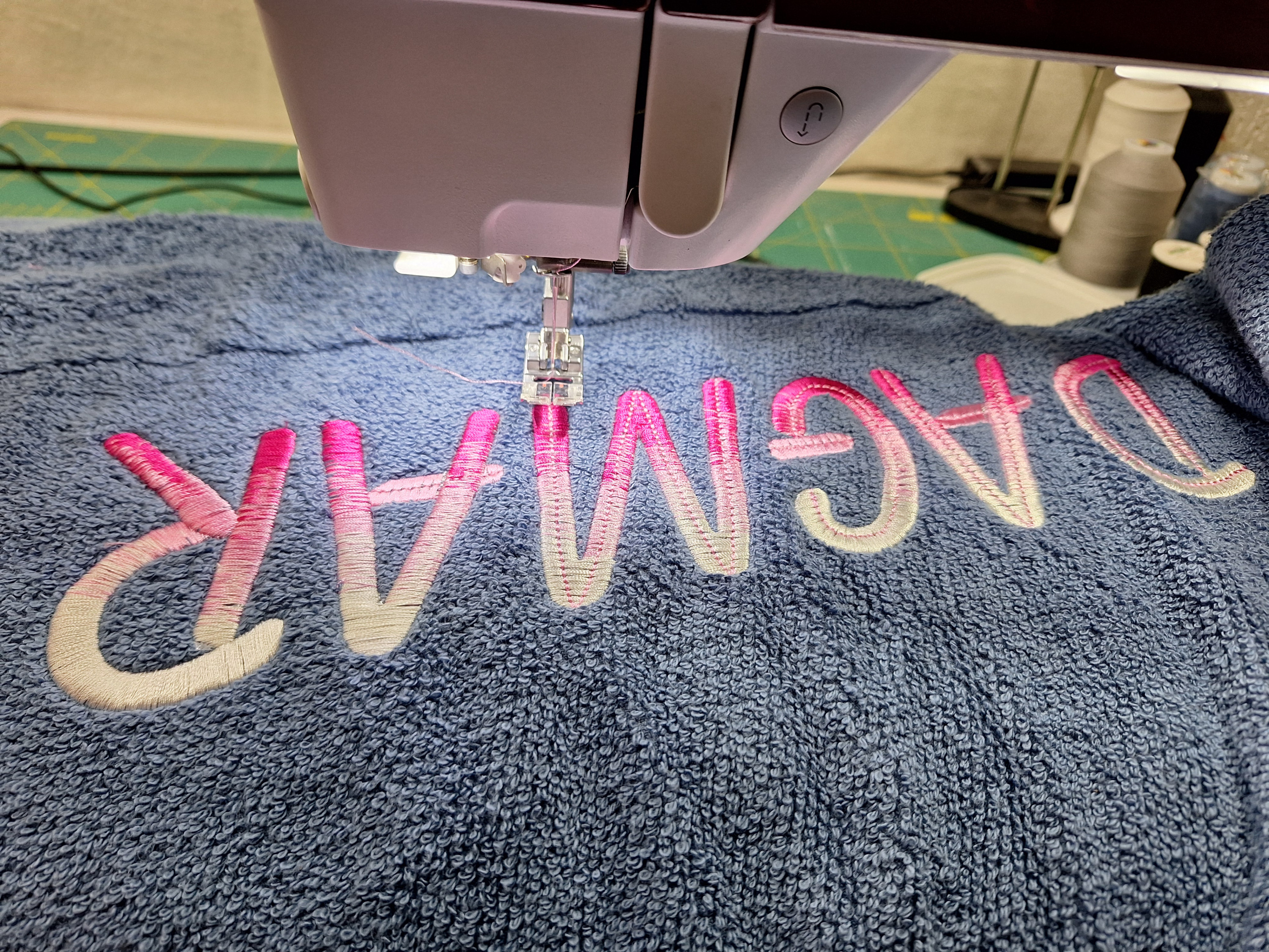 Anlässlich Weihnachten als Dankeschön für eine Kursleiterin im Auftrag der Gruppe ein Duschtuch mit Namen bestickt. Das Besondere an der Schrift ist der Farbverlauf aus 3 Farben in jedem Buchstaben. Da die Satinstiche sehr lang sind (beim M oben länger als 1 cm), habe ich zur Sicherung gegen Beschädigung " von Hand" eine mittige 3fach Naht auf jeden Buchstaben genäht; natürlich mit der Maschine genäht, aber frei geführt, nicht im Rahmen von der Maschine sticken lassen.