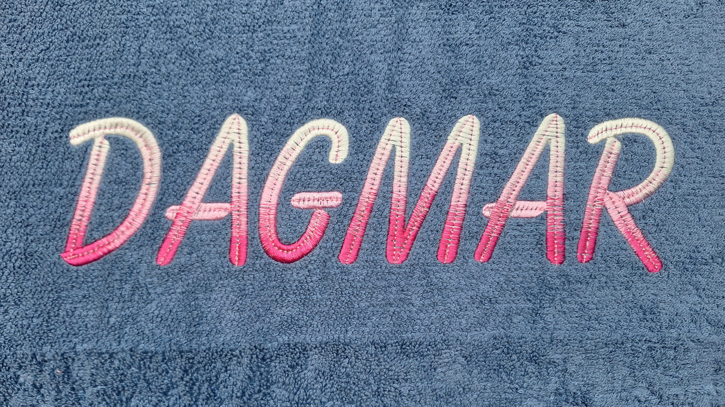 Anlässlich Weihnachten als Dankeschön für eine Kursleiterin im Auftrag der Gruppe ein Duschtuch mit Namen bestickt. Das Besondere an der Schrift ist der Farbverlauf aus 3 Farben in jedem Buchstaben. Da die Satinstiche sehr lang sind (beim M oben länger als 1 cm), habe ich zur Sicherung gegen Beschädigung " von Hand" eine mittige 3fach Naht auf jeden Buchstaben genäht; natürlich mit der Maschine genäht, aber frei geführt, nicht im Rahmen von der Maschine sticken lassen.