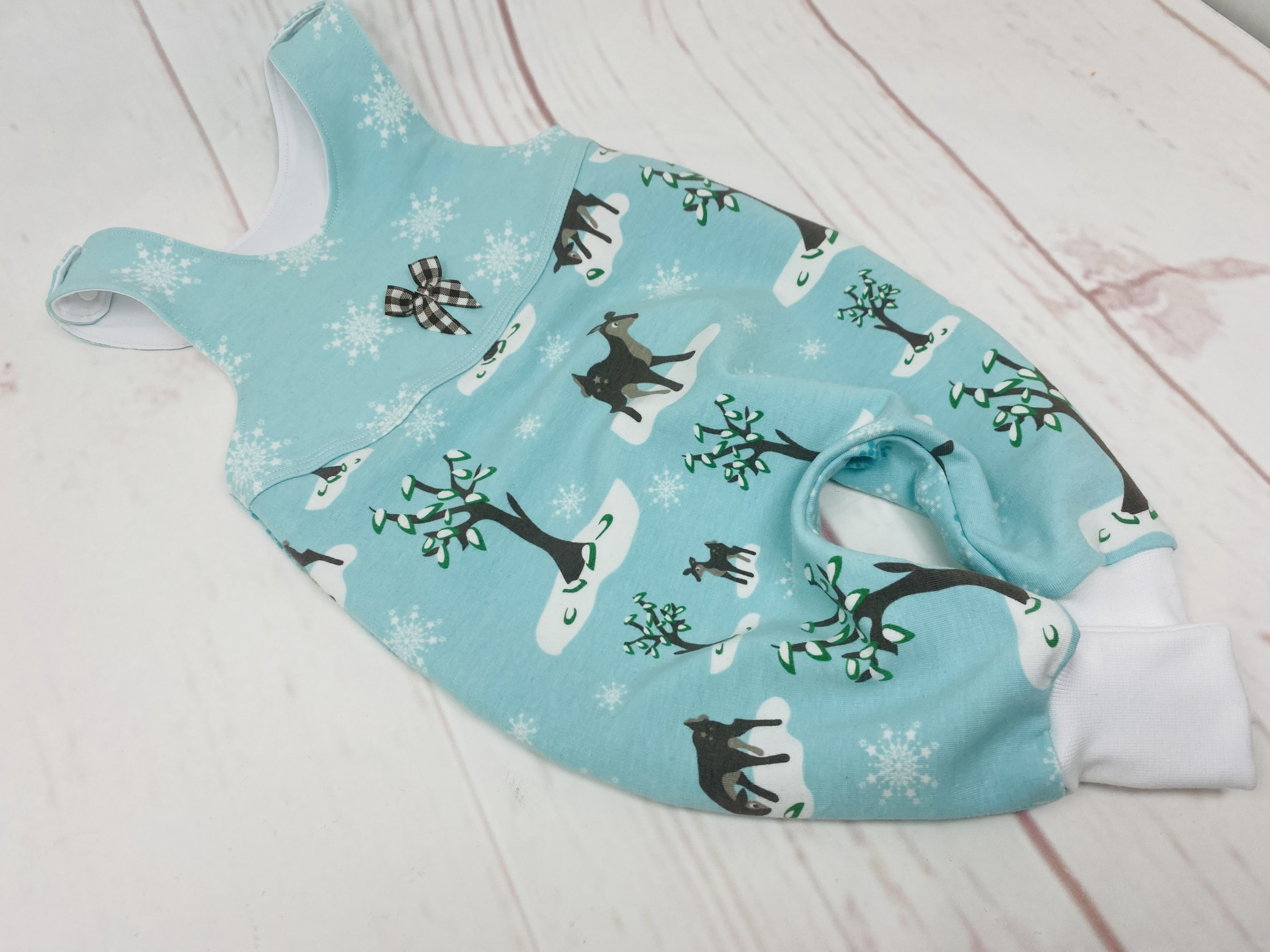 Hier noch der Strampler aus meinem Jahres UWYH 2025 - vorne aus 2 Stoffen, der Kombistoff mit den großen Schneeflocken ist auf der Rückseite. Und dazu noch ein kleines passendes Schleifchen.