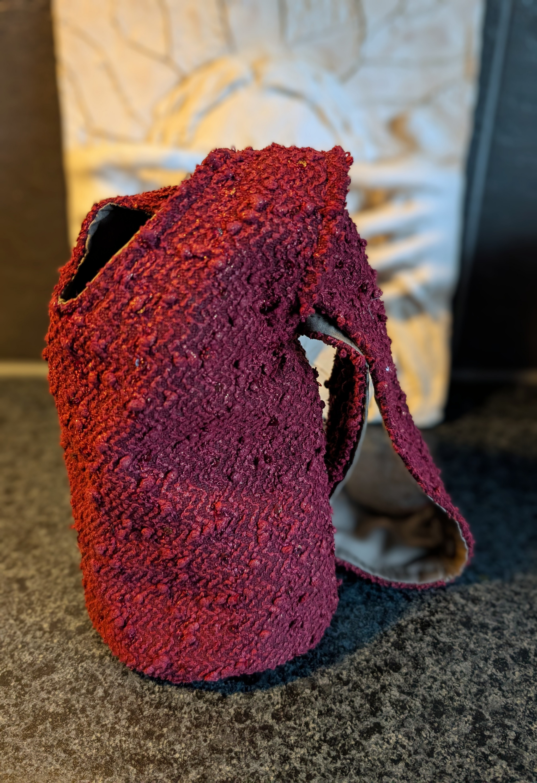 Die ist aus einem Stoffrest entstanden und ist eine japanische Knotentasche, allerdings mit rundem Boden.