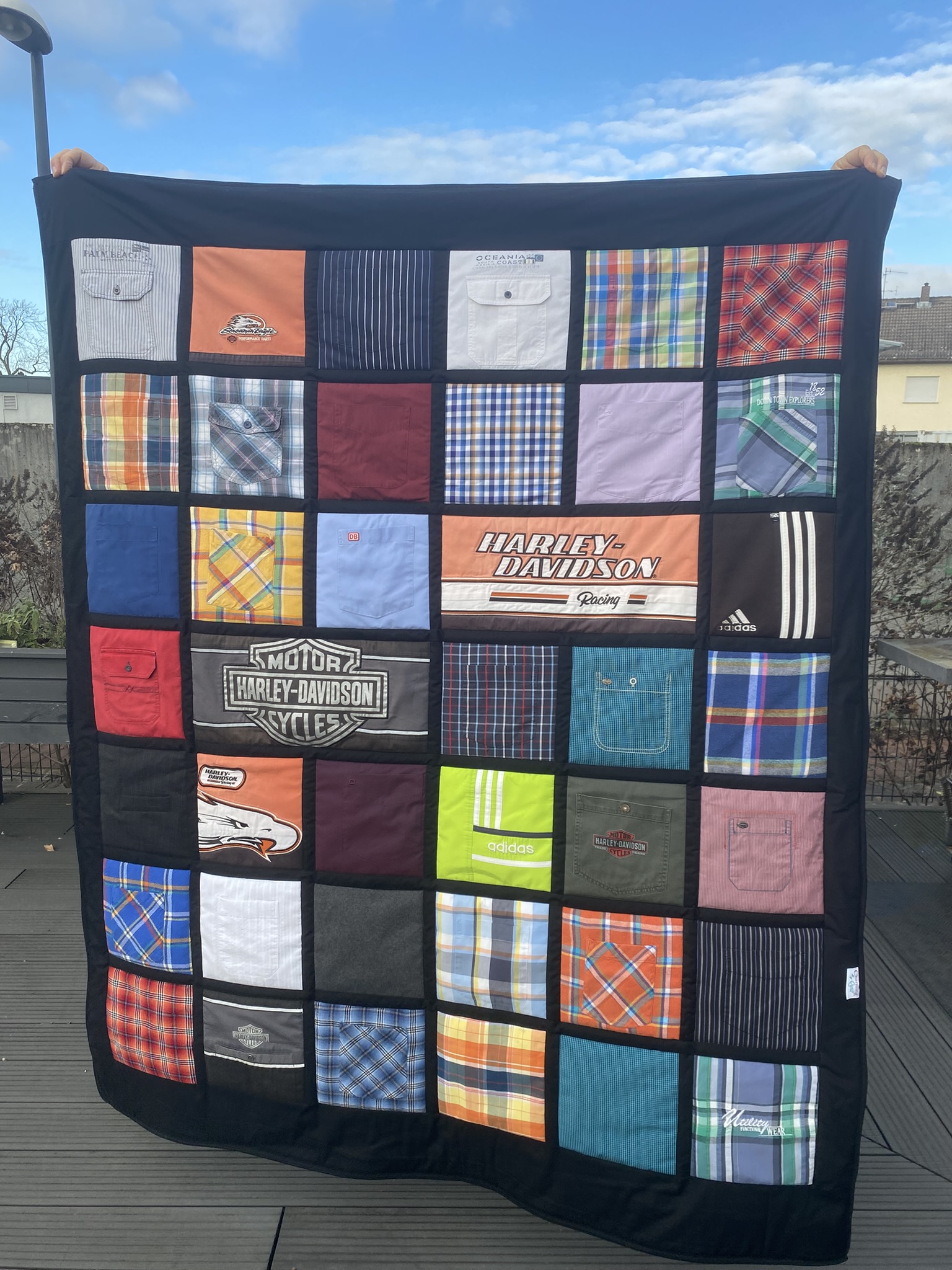 für einen geliebten Papa und Harley Fan durfte ich diese Memorydecke nähen. Mehr Infos und Bilder sind in meinem Blog: http://blog.charmingquilt.com/…rungsdecke-fuer-den-papa/