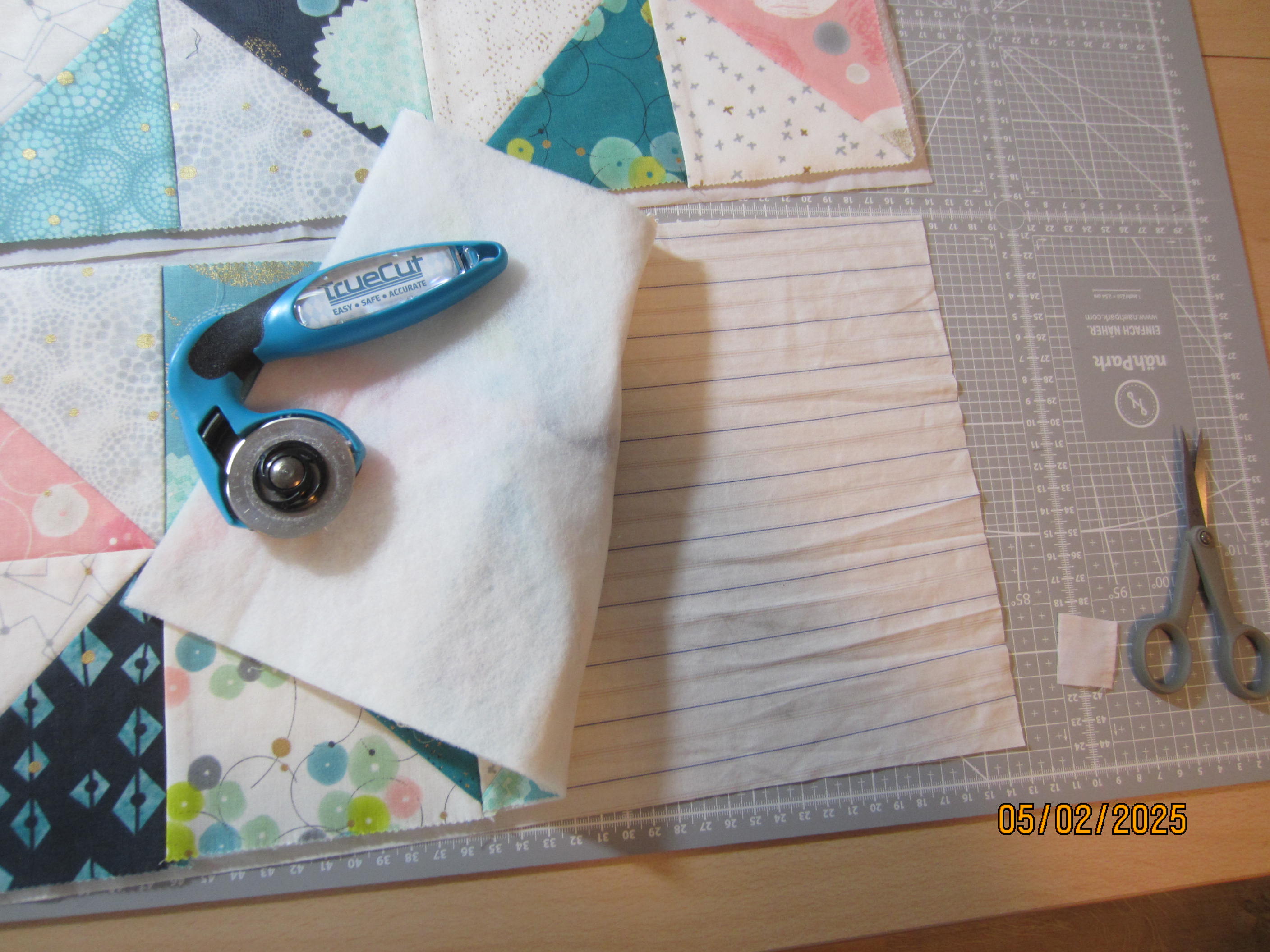 Deshalb eine weitere PW-Übung, diesmal mit Teilen eines Charm Pack DANCE IN PARIS by Brigitte Heitland for ZEN CHIC für Moda, erworben im Online-Shop von CharmingQuilts