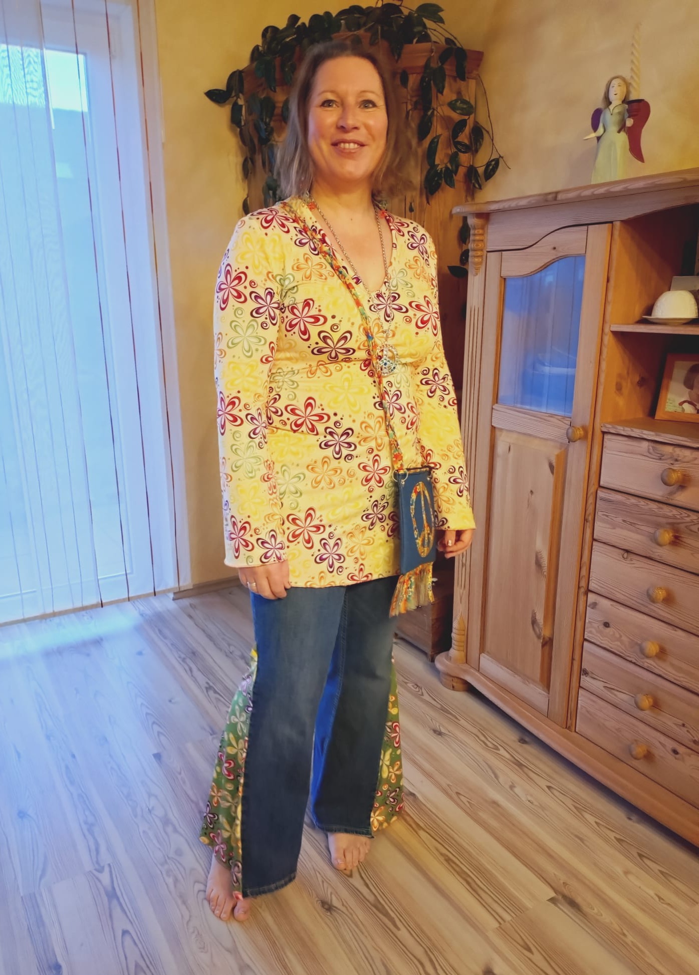 Die Jeans am Hintern eingerissen, so blöd, dass es nicht unsichtbar repariert werden konnte. Also habe ich die Taschen abgetrennt, größere Taschen drauf genäht aus dem gleichen Stoff, wie der Schlag ist. Der Stoff war auch von Buttinette und schon mal ein Kleid. Komplett upgecycelt.