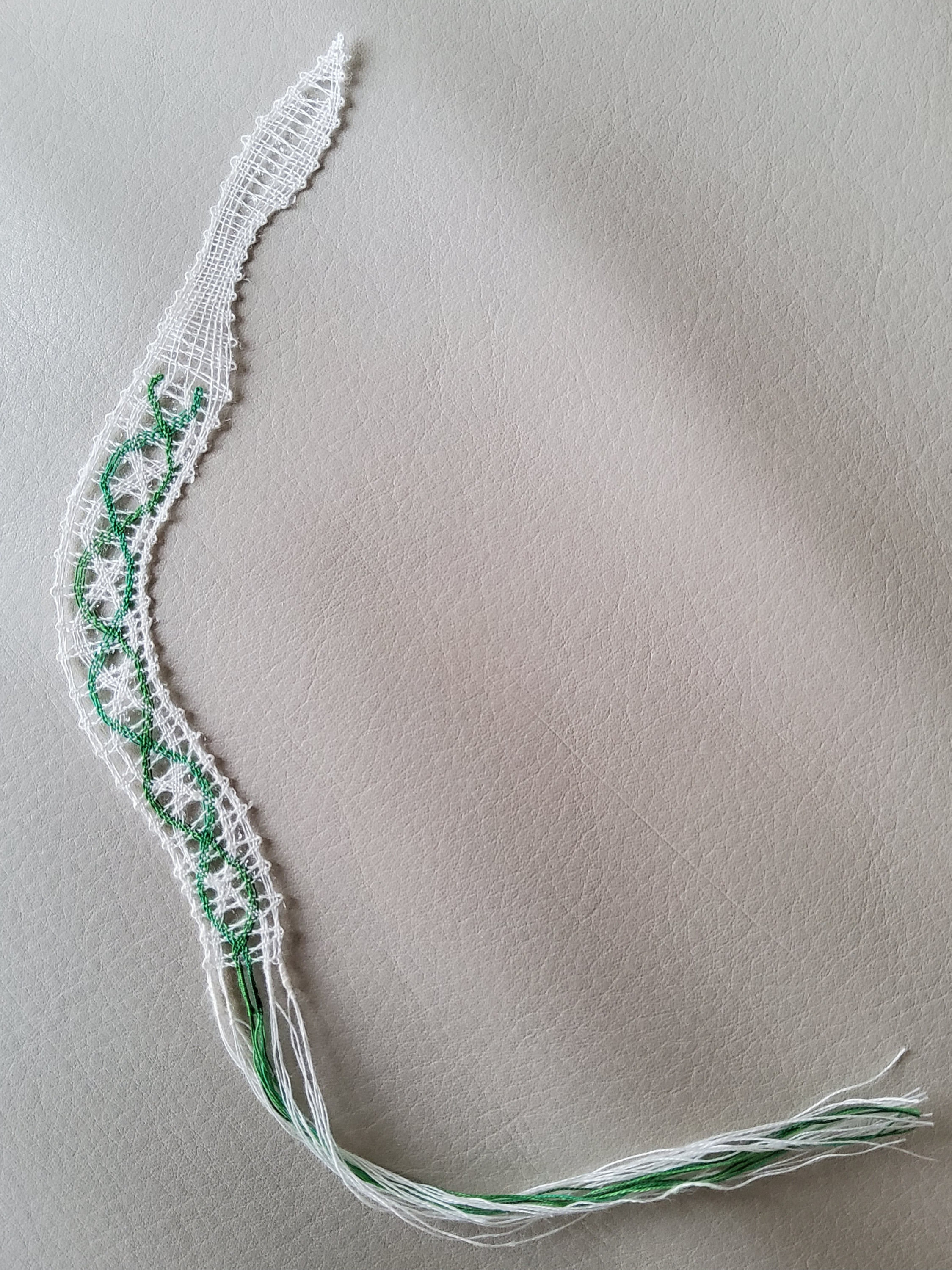 Das grüne Garn ist ein Valdanigarn, das weiße ist mein dünnes Klöppelgarn für alle Fälle