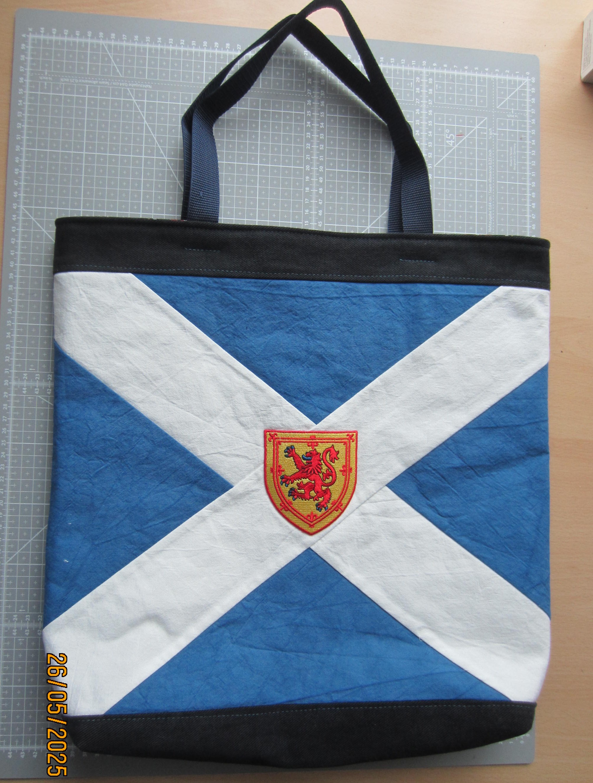 Die blaue Schottlandfahne mit dem weißen "Saltire" hat mir einiges an Gehirnschmalz abverlangt - das aufgebügelte Wappen gabs bei Amazon.