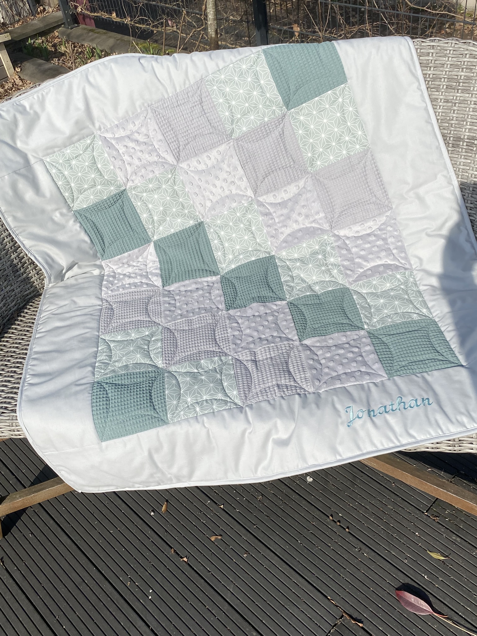 von einer Kundin wurde die Decke in Salbei und Grau noch einmal gewünscht. Da ich keine Kopien mache, gab es auf Wunsch ein anderes Format, eine andere Rückseite und eine etwas andere Bestickung.