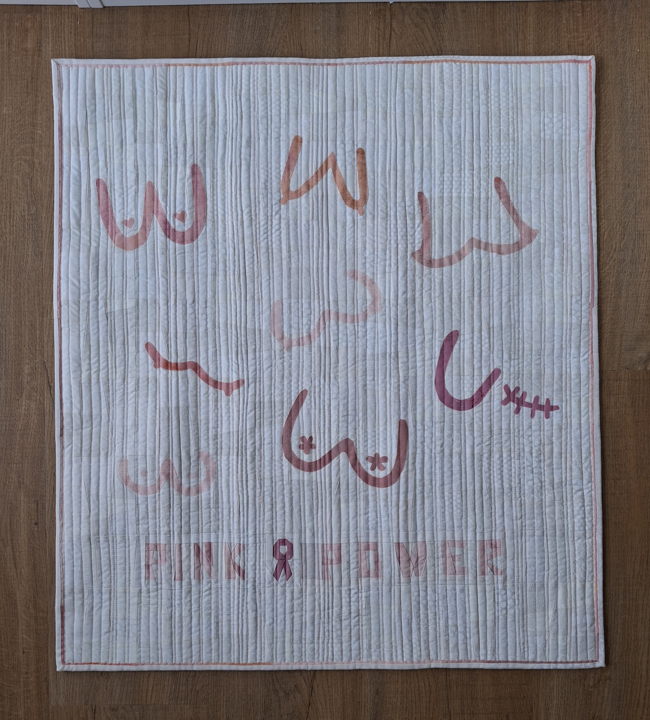 Dieser Quilt erzählt eine Geschichte von Schmerz, Mut und Hoffnung. Acht rosa Brüste – eine davon gezeichnet von einer Narbe. Denn jede achte Frau in Deutschland erhält die Diagnose Brustkrebs.