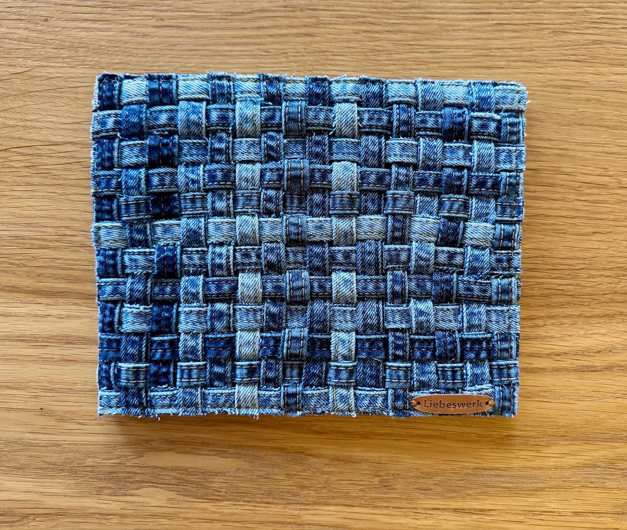 Aus den abgeschnittenen Innenbein-Nähten alter Jeans. Aufgenäht auf ein Stück Wollfilz.