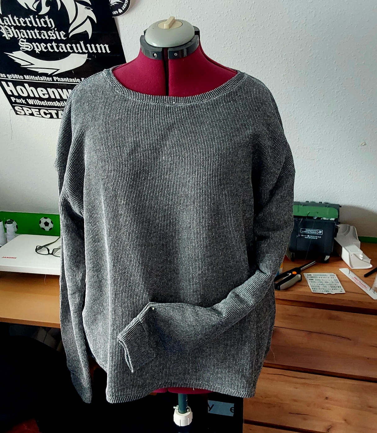 Der Pulli ist schön weit geschnitten, ein echtes Wohlfühlstück. Passende Bündchen hatte ich nicht, also habe ich diese aus dem Originalstoff gemacht