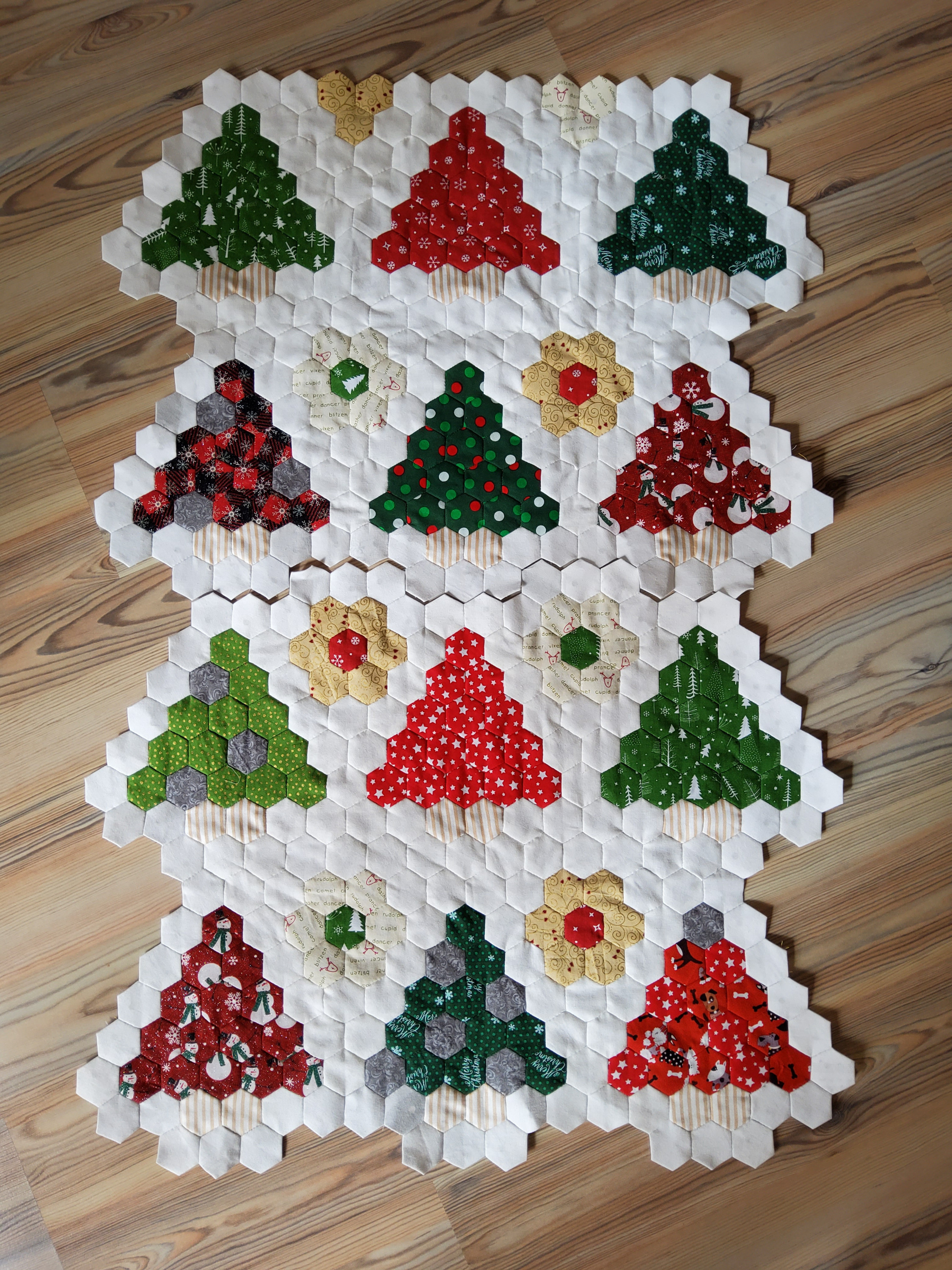 Neuer Zwischenstand, erstmal fehlt nur noch eine Naht, und dann muss ich entscheiden, wie es weitergeht. Auf jedenfalls gibt’s eine 2-hexibreiten Rand, das ist dann auch die richtige Breite. Die Löcher seitlich muss ich dann nach füllen, da weiß ich noch nicht, wie ich das mache. Aber ich muss sowieso erstmal heften, ich denke, Weihnachten 2025 kommt doch wieder früher als erwartet ![]()