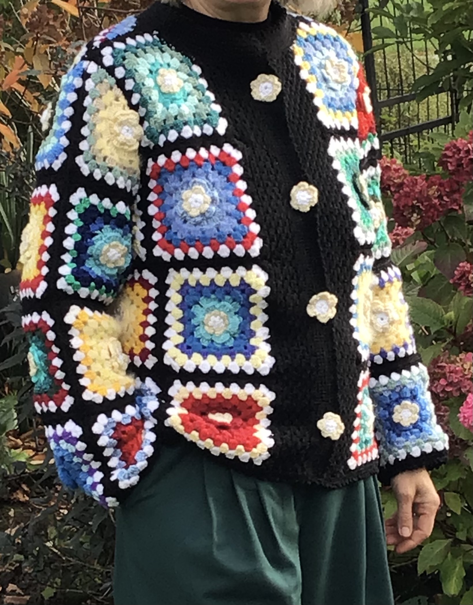 Meine Häkeljacke ist nach einem Jahr Arbeit fertig. Ich muss zugeben, Nachdenken nach jedem Schritt hat am Längsten gedauert. Die Jacke habe ich ohne eine Vorlage gearbeitet, sie ist ausschließlich aus Garnresten entstanden.