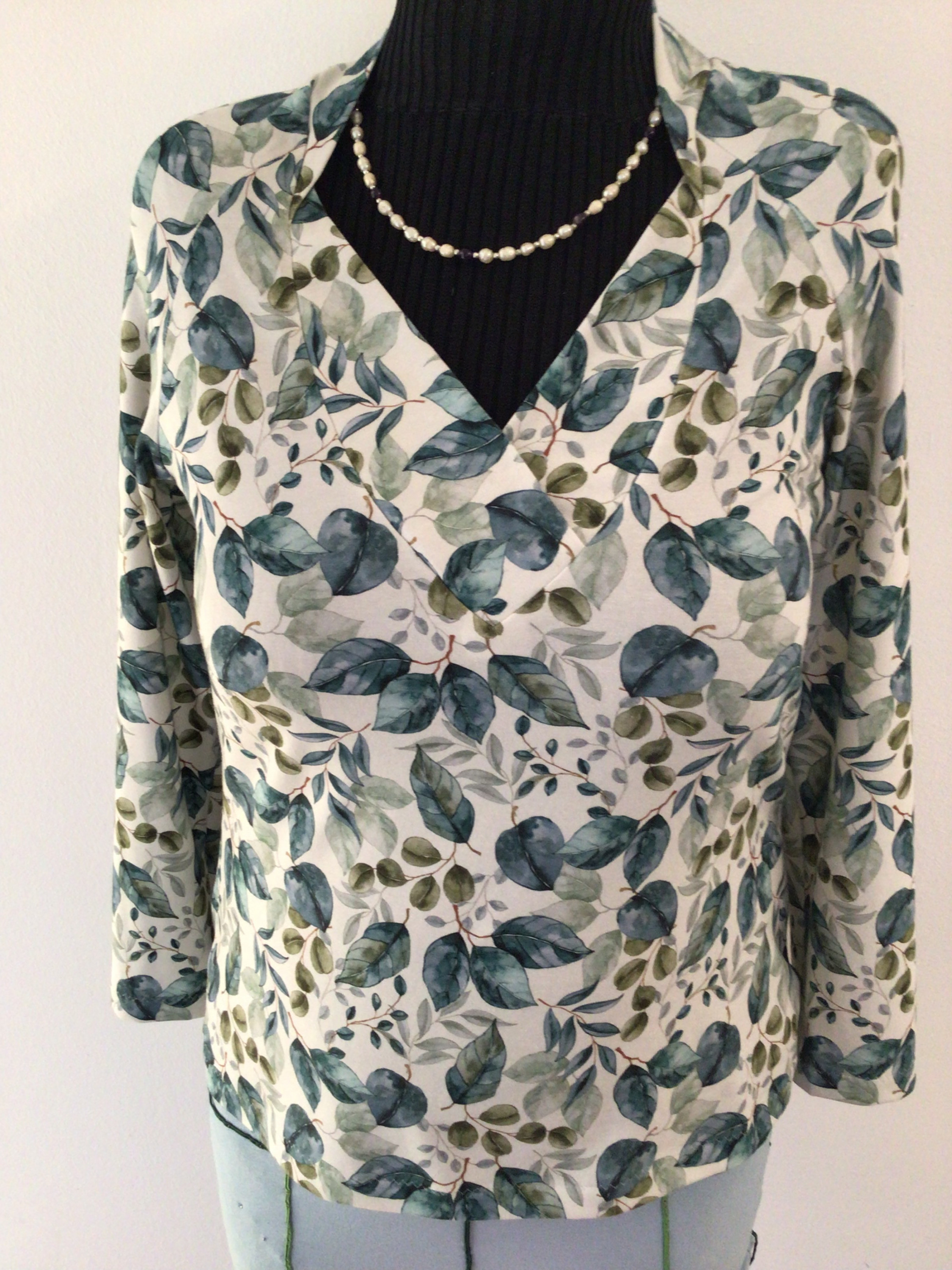 das erste Shirt aus einer Serie von drei. Der Grundschnitt ist das gut angepasste „Ruckzuck Kleid“ gekürzt zu einem Shirt. Den runden Ausschnitt habe ich in einen V-Ausschnitt gewandelt, abgekupfert aus der fashionstyle 07/2019.