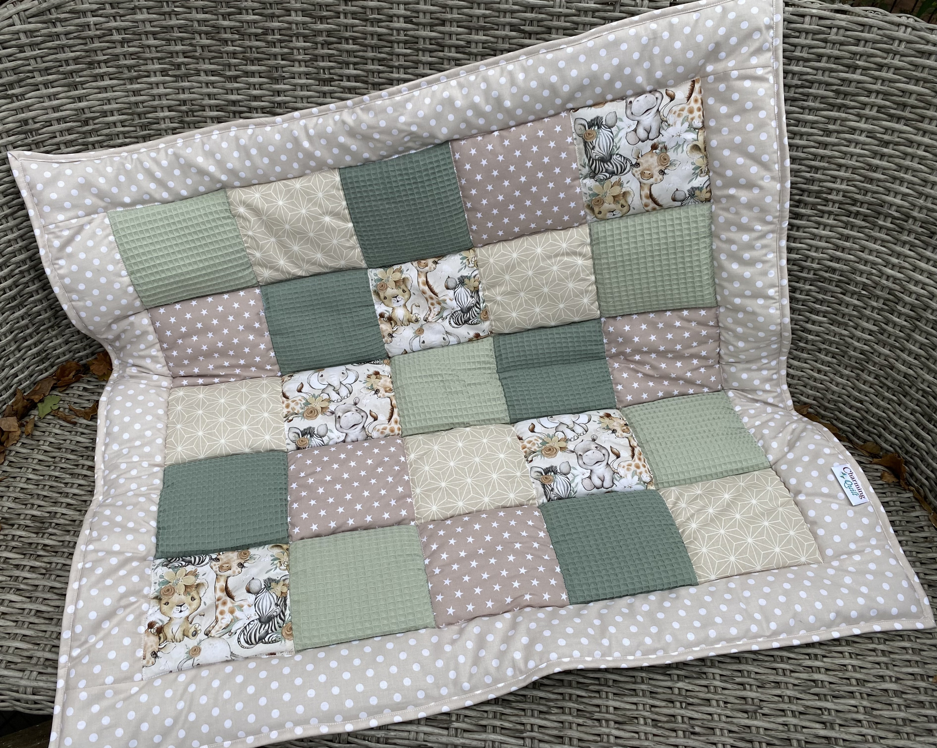 ich hab mal wieder eine neue Krabbeldecke zum Zeigen: genäht mit Waffelpique und den süßen Safari Tieren. Farben sind salbei und creme/beige.