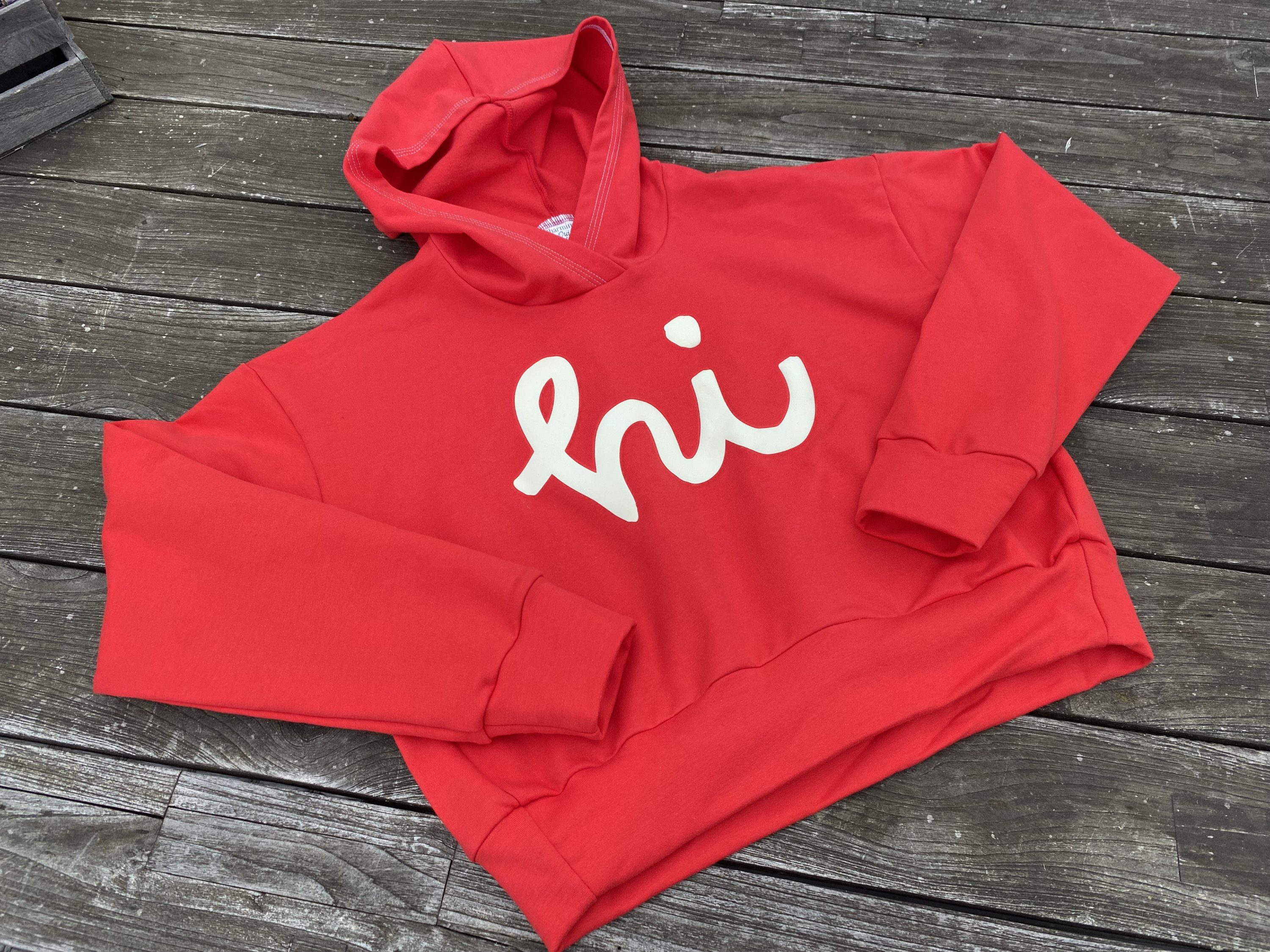 ich hab für die Murmel genäht: ein Crop Pulli in Größe 152 in knalligem Rot