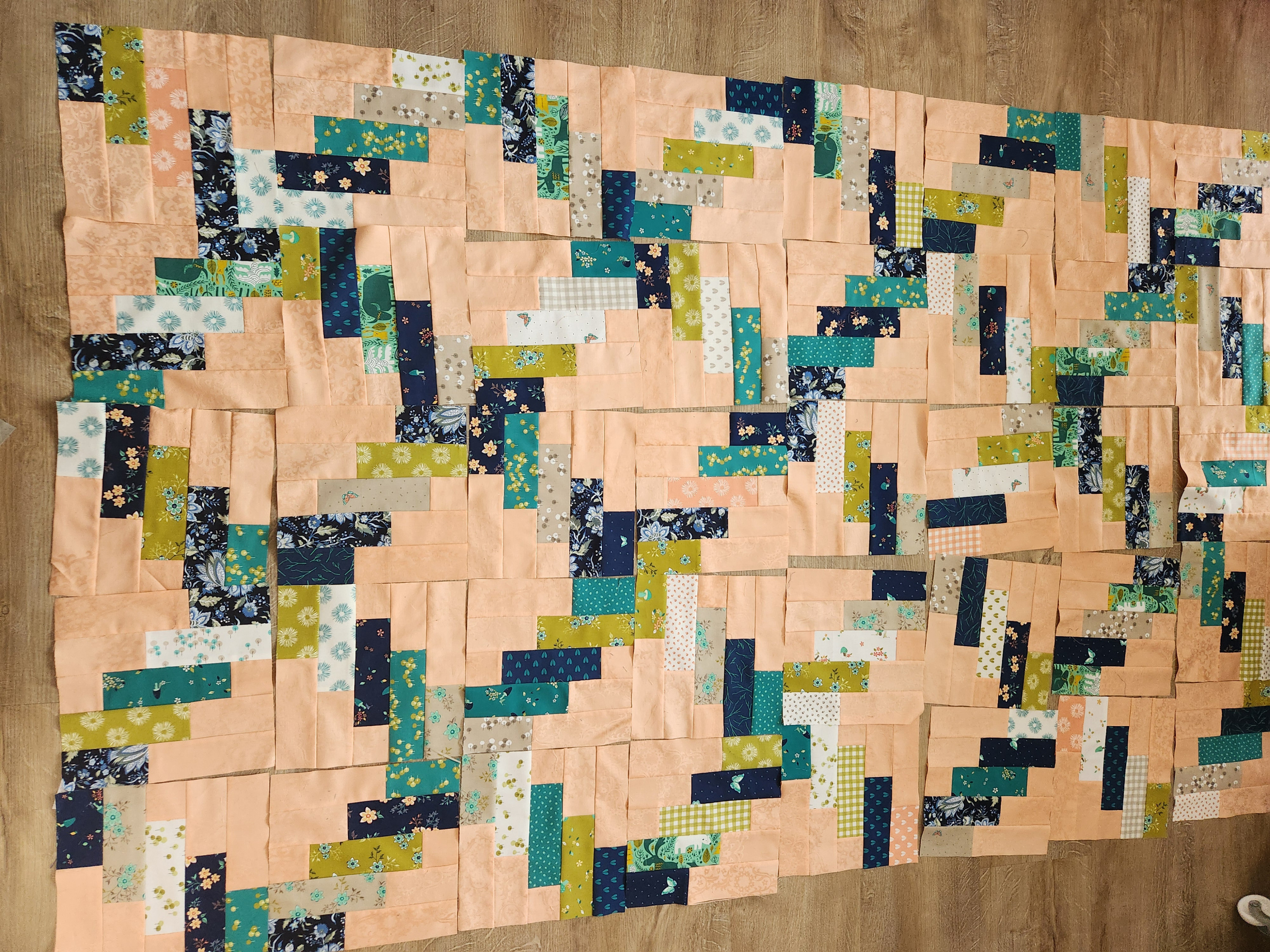 Falls du Lust hast, noch ein wenig zu tauschen, hier ein Tipp: Meiner Meinung nach springen die ganz hellen und ganz dunklen Streifen am stärksten ins Auge, gefühlt die "weißen" und "schwarzen". (Das ist normal und soll auch so sein.) Deshalb würde ich z. B. von den 3 Blöcken oben links mit den großen blauen Blumen auf weißem Grund einen tauschen gegen irgendwo ganz rechts, weil sich die Blumenstreifen oben links zu sehr verbünden, besonders wo sie aneinanderstoßen. Hab ich das verständlich rüberbringen können?