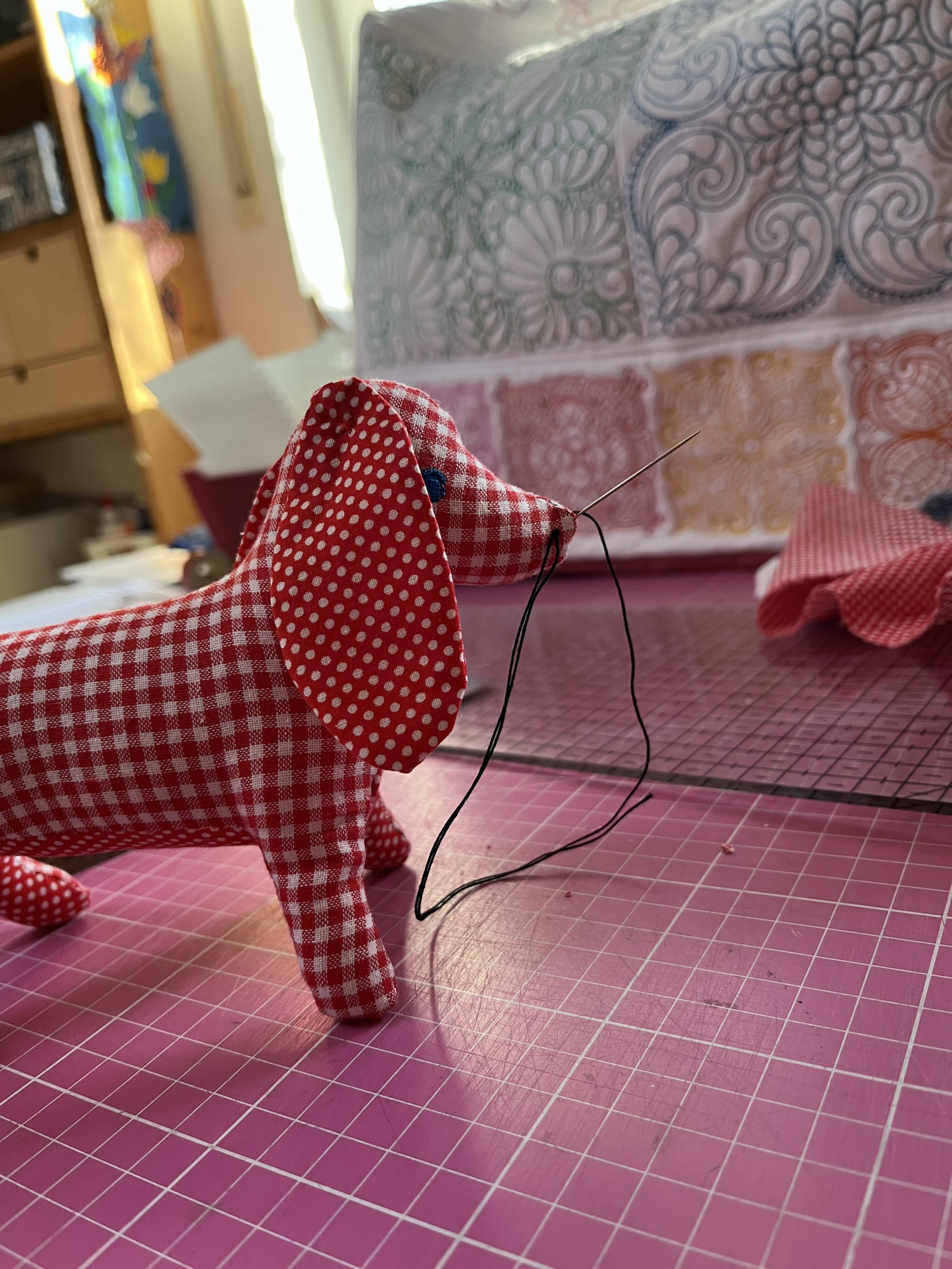 Eigentlich soll man als Nase eine Teddynase aus Kunststoff anbringen, aber sowas habe ich nicht. Deshalb nähte ich die Nasenöffnung zu und stickte die Nase mit dickem Baumwollgarn auf. Das ging recht streng, so dass ich nach meinem Werkzeug suchte, um die Nadel besser packen und durchziehen zu können. Da stand das Dackeltier dann so auf dem Tisch und ich fand es so lustig, dass ich schnell ein Foto knipste.