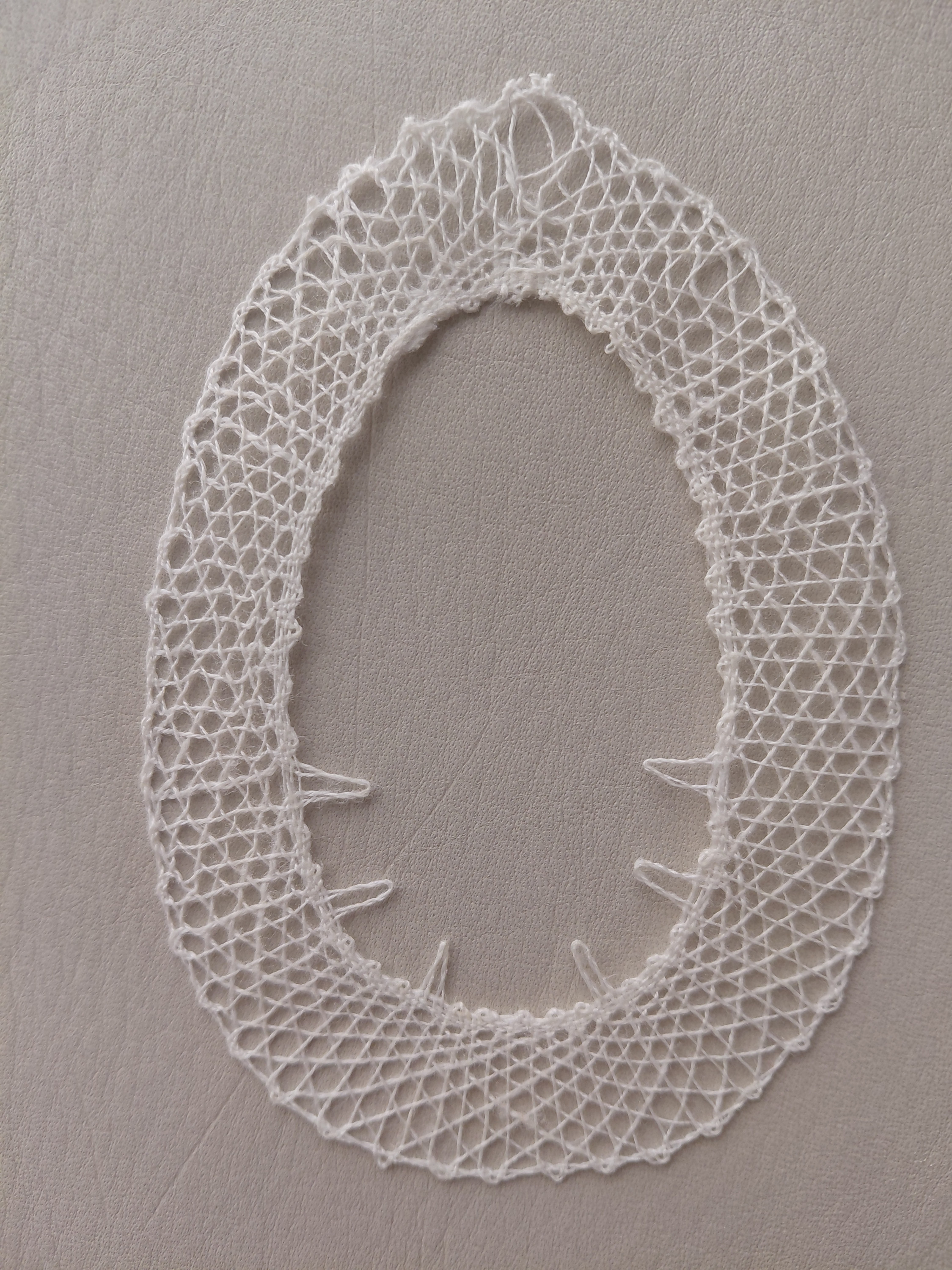 Gelernt habe ich hier den unsichtbaren Anfang im Halbschlag. Noch mit Fehlern, wie man am großen Loch sieht, aber ich glaube, ich habe es verstanden. Und um das zu testen, ist das gleich nochmal dran, auch wenn Ostern vorbei ist. Diesmal nehme ich ein stabiles Baumwollgarn und nicht so ein reißfreudiges Leinengarn wie hier. Dann wird es bestimmt gut werden!