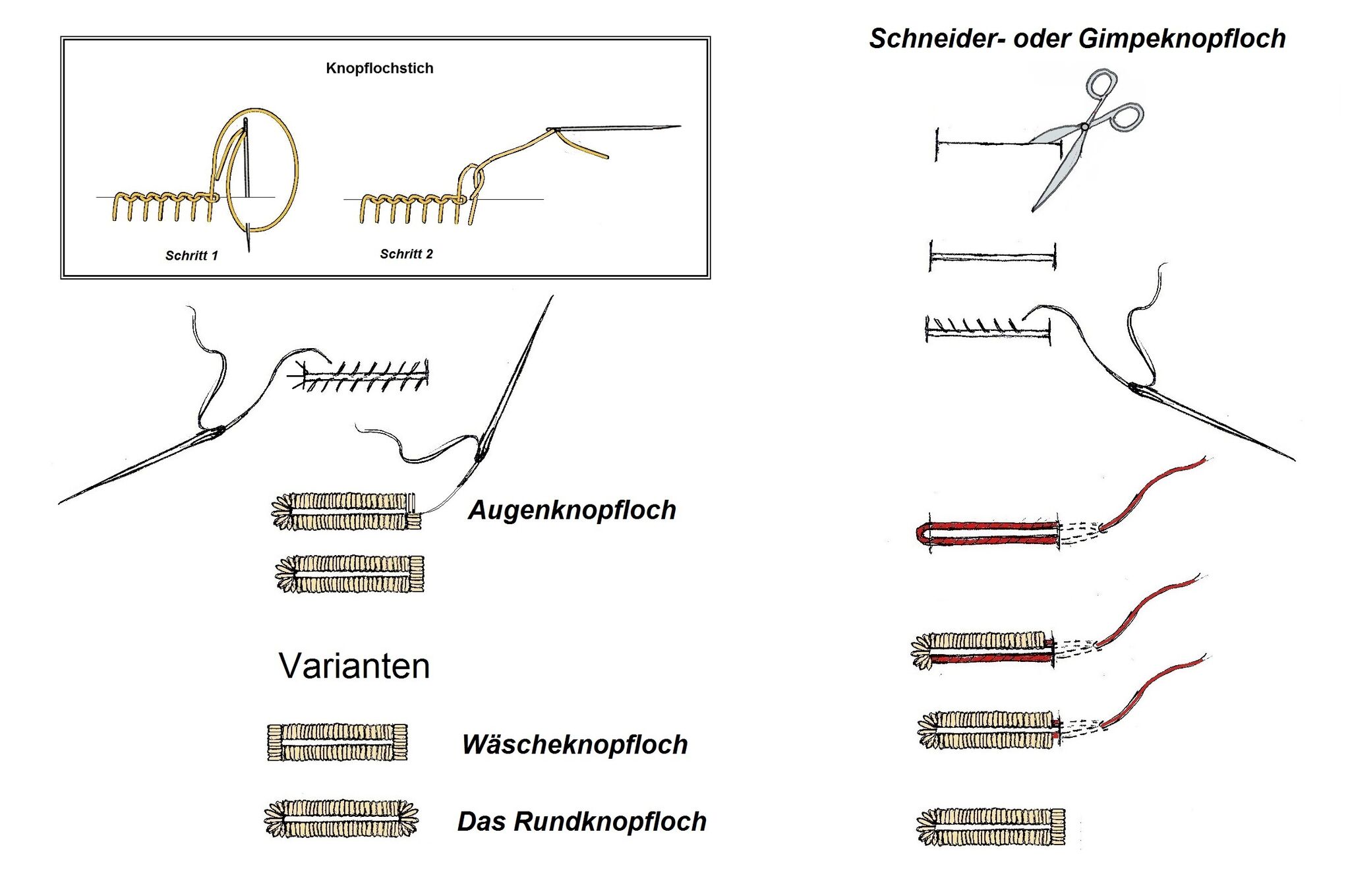 Näht man ein Augenknopfloch mit der Hand, spricht man vom klassischen Schneiderknopfloch, welches erst aufgestanzt und aufgeschnitten wird und über eine Gimpe oder einen Beilauffaden mit Langetten- / Festonstich genäht wird.