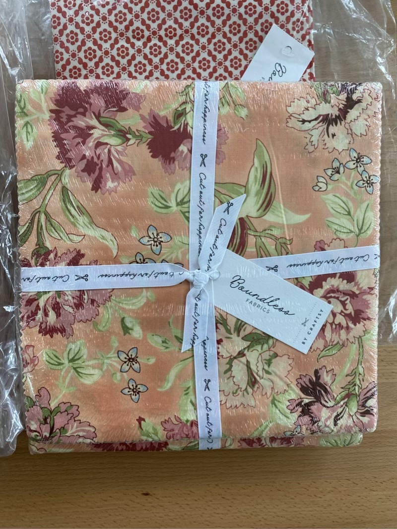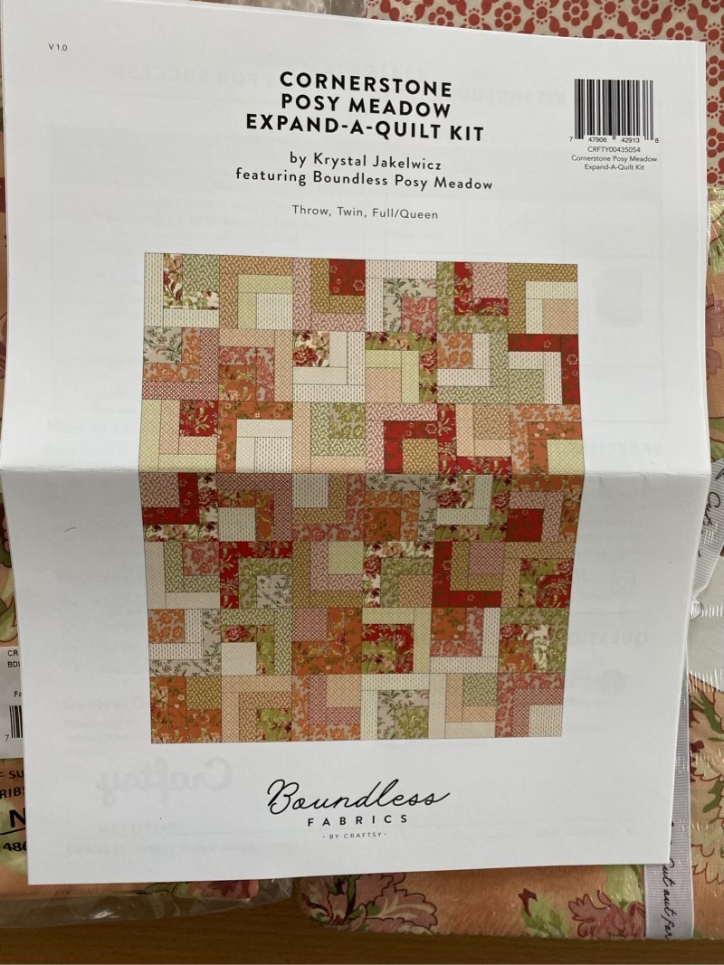 Angeboten wird das Quiltkit Cornerstone Posy Meadow in Queen Size ( 93“ x 93“ ). Es besteht aus 3 Layer Cake ( 42 Stück ), 1 yard für das Binding und 9 yard ( 3 x 3 ) für das Backing. Der Stoff ist von Boundless aus der Serie Posy Meadow und aus 100 % Baumwolle.