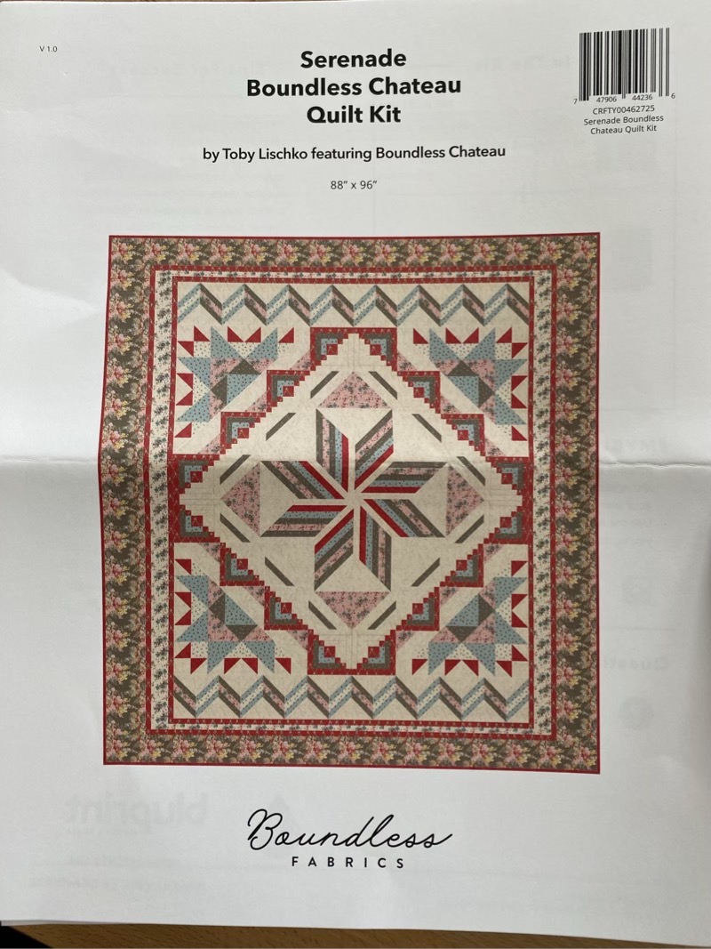 Angeboten wird das Quiltkit Serenade Boundless Chateau in 88“ x 96“. Es besteht aus 12 1/4 yard Stoff und 8 yard ( 2 x 4 ) für das Backing. Der Stoff ist von Boundless aus der Serie Chateau und aus 100 % Baumwolle.