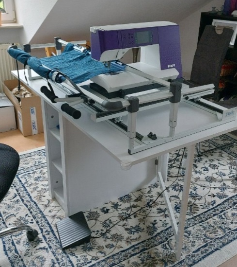 Ich verkaufe meinen 4 Wochen alten Cutie Frame, welchen ich nur einmal genutzt habe. Ich habe festgestellt, dass mir das herkömmliche quilten mit der Nähmaschine besser liegt. Vielleicht findet er ja eine neue Besitzerin die ganz glücklich mit ihm ist. Der Rahmen passt auf einen Tisch oder Schreibtisch. Auf dem Wagen kann eine normale Haushaltsnähmaschinen oder eine Quilmaschine bis 19 Zoll eingeklemmt werden. Der Wagen lässt sich butterweich mit 2 Fingern führen. Es wird nur Selbstabholung in Neustadt an der Weinstraße angeboten, der Rahmen ist komplett aufgebaut. Neu habe ich 960 Euro bezahlt.