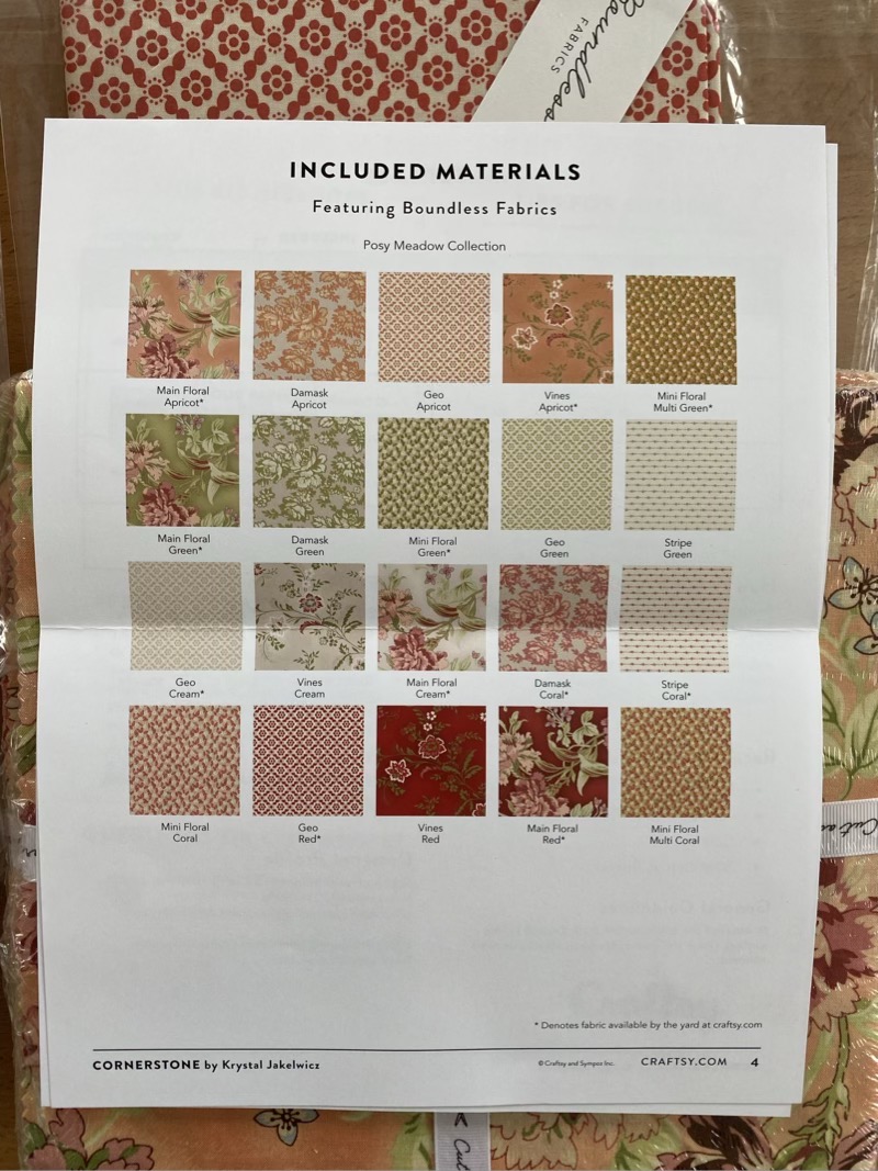 Angeboten wird das Quiltkit Cornerstone Posy Meadow in Queen Size ( 93“ x 93“ ). Es besteht aus 3 Layer Cake ( 42 Stück ), 1 yard für das Binding und 9 yard ( 3 x 3 ) für das Backing. Der Stoff ist von Boundless aus der Serie Posy Meadow und aus 100 % Baumwolle.