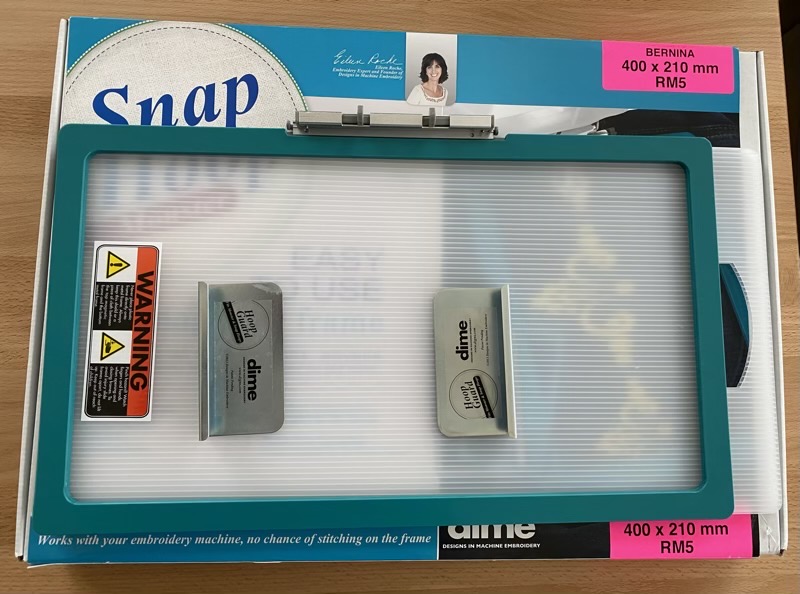 Angeboten wird ein Snap Hoop Monster Magnetrahmen für Bernina 21 x 40 cm. Dazu gibt es zwei Hoop Guards, die verhindern, dass bei größeren Teilen der Stoff beim Sticken in den Rahmen fällt.