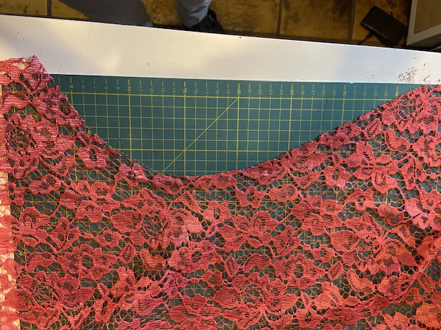 • Spitze in kräftigem Lachs. 1,2 Meter. An der einen Seite sind an der Bogenkante zwei Ärmel ausgeschnitten. Die andere Bogenkante ist komplett intakt.