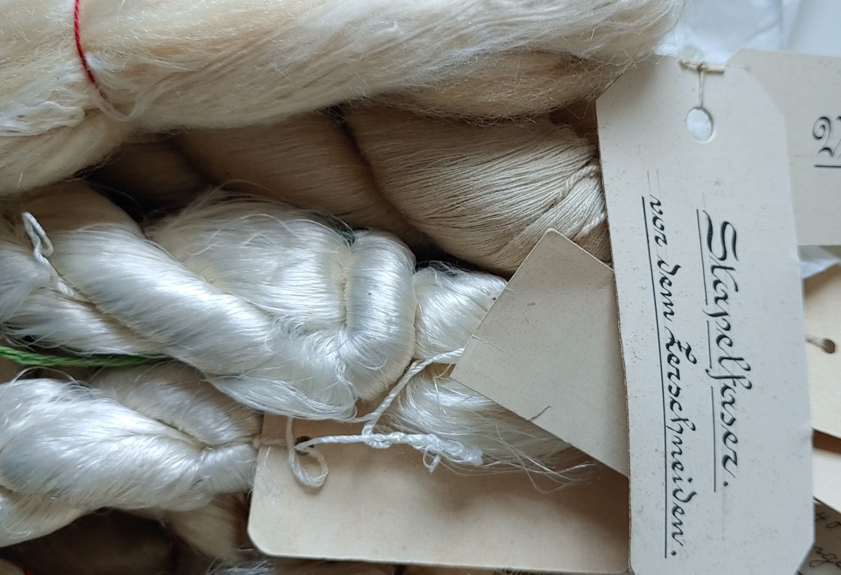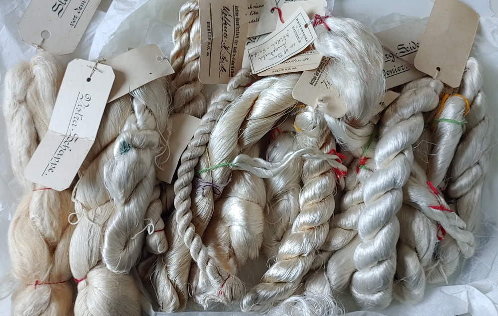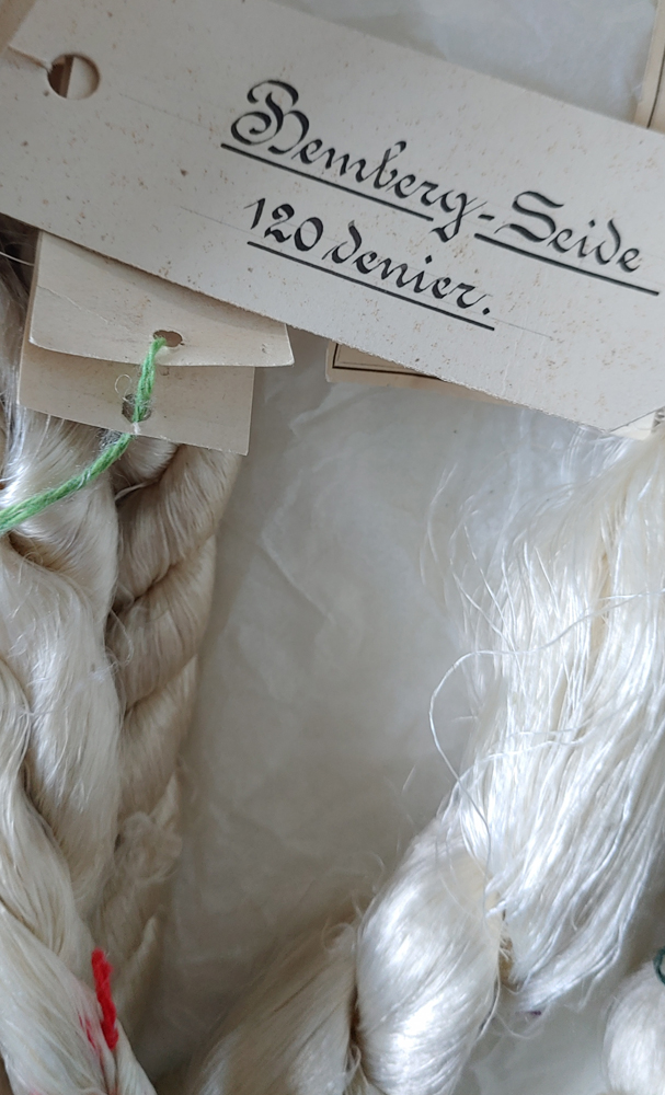 Ich hab die Garne mal günstig auf dem Flohmarkt gekauft mit dem Ziel zu färben. Aber dann waren sie mir immer zu schade dafür. Alleine die Schilder sind schon wunderbar, viele der Garne sind aus Seide und Viskose. Ich schätze das Alter auf etwa 80 - 100 Jahre. Es sind knapp 20 Stränge, von mini bis dick.