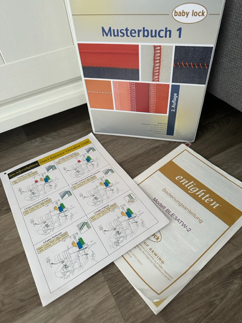 Es gibt dazu das Musterbuch, Bedienungsanleitung, sowie unterschiedliche Füße zur Maschine,