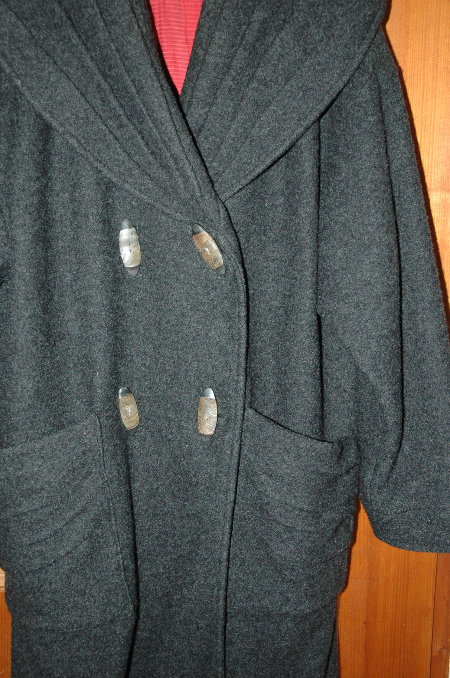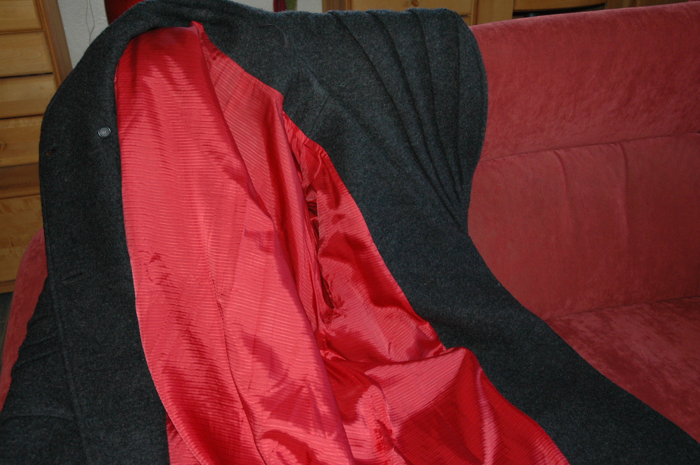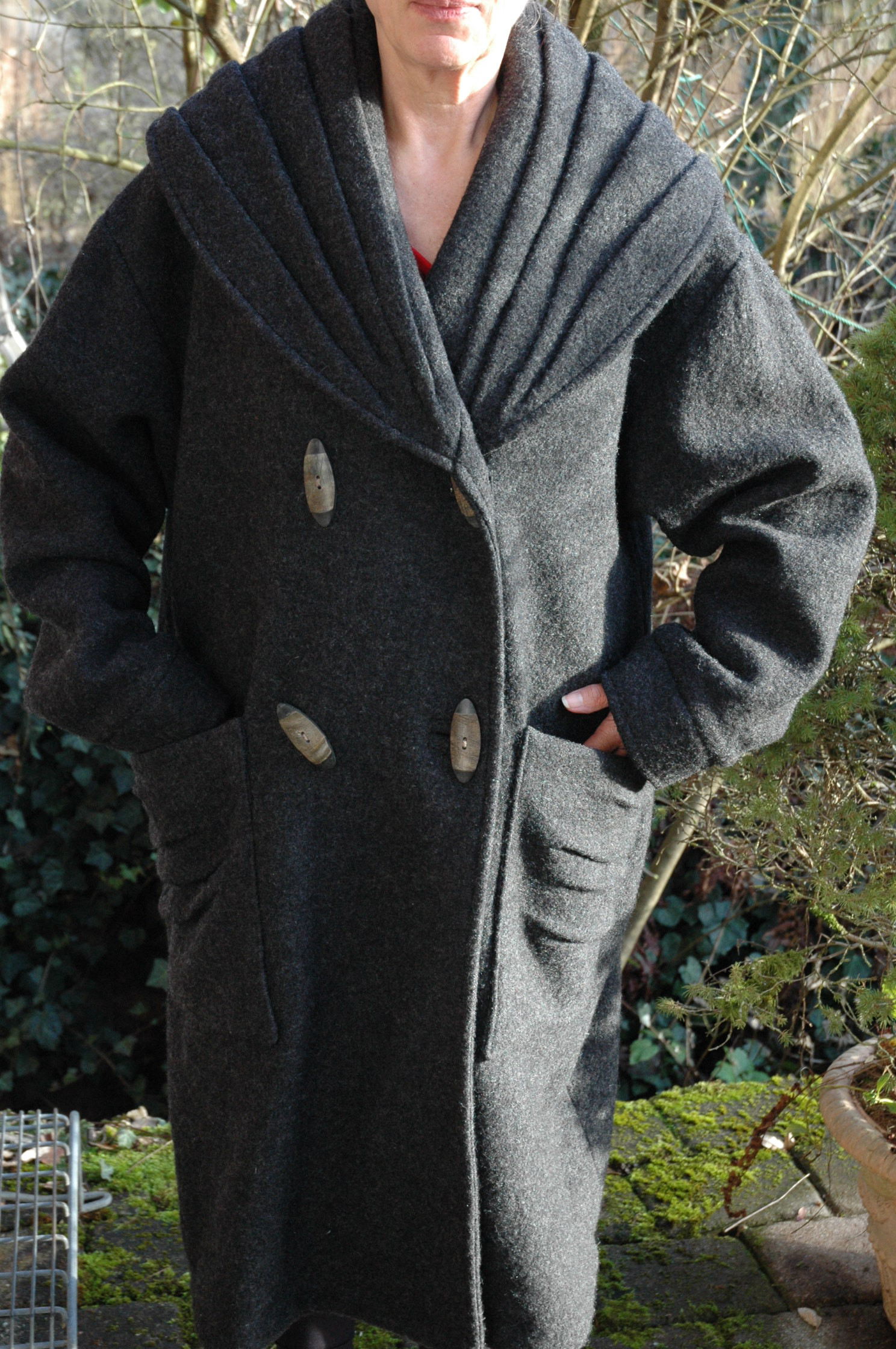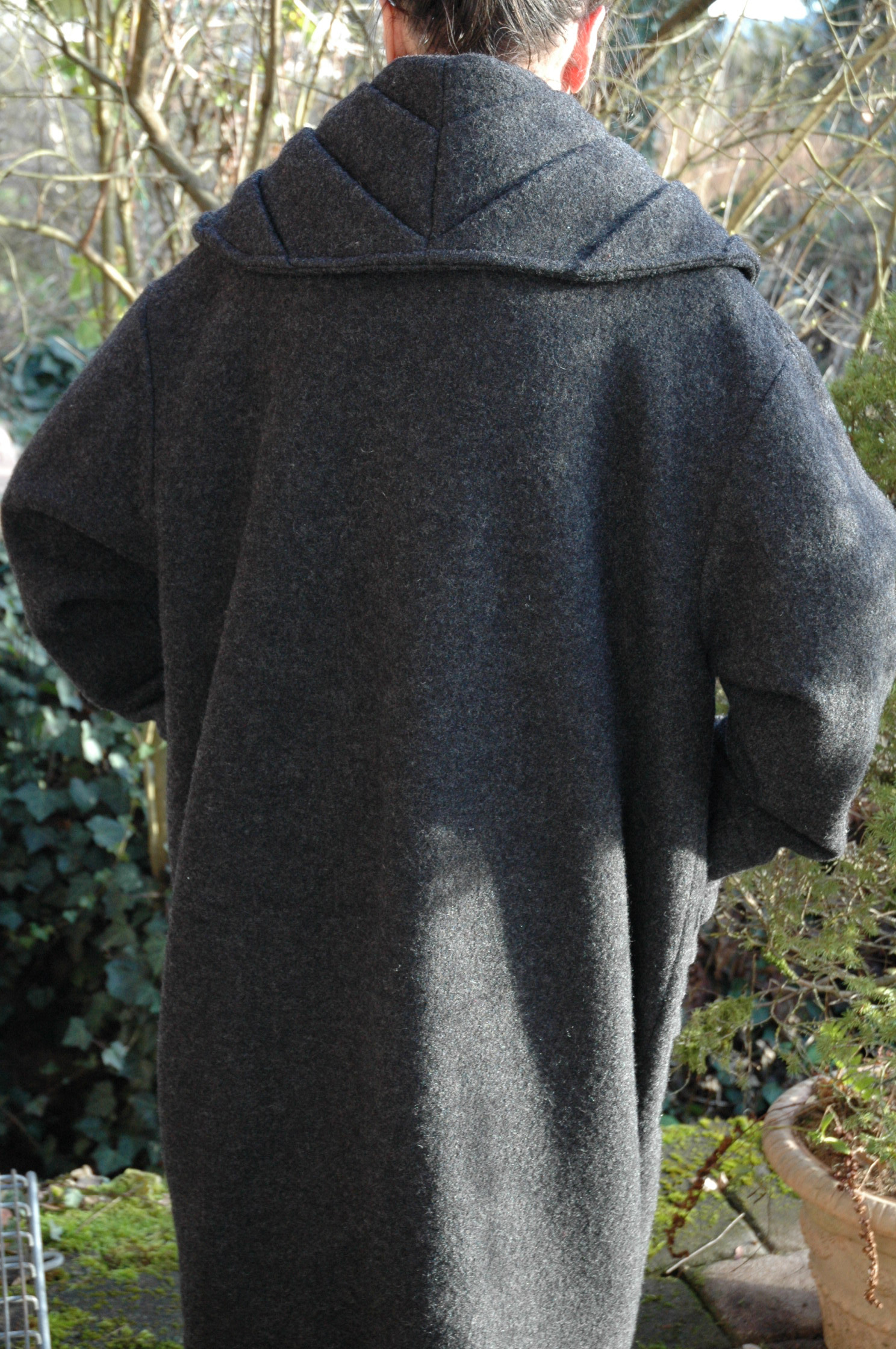 wir gehen nach Spanien. Dort ist dieser Mantel zu warm! Ich finde den Kragen und die Taschen und überhaupt den ganzen Mantel so toll. Also frage ich hier mal in die Runde, ob den jemand möchte? Ich stelle mir vor, ungefähr den Materialpreis erstattet zu bekommen. Es passt auch problemlos ein Pulli drunter. Wie ihr sehen könnt, ist er mir auch etwas zu groß? Oder vielleicht muß das so? Genäht habe ich nach dem Schnitt "Tibet" von Susann Di, in Größe S. Den Schnitt habe ich übrigens auch noch zum verkaufen. Liegend gemessen ist der Mantel ca. 1,45 m breit und 1,20 m lang.