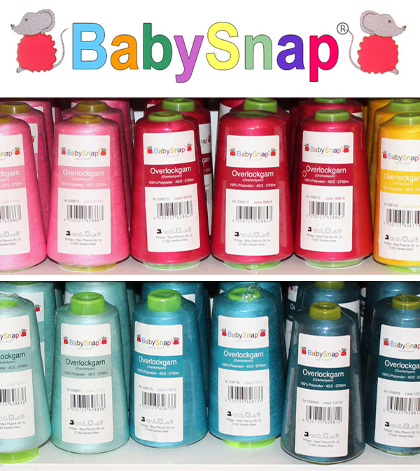 Babysnap Overlockgarn in über 25 kombinationsfreudigen Farben! Die bewährte Qualität eignet sich für alle Overlock- und Coverlock-Maschinen ist bis 95°C waschbar und 1 Punkt Trockner geeignet - preiswert & gut!