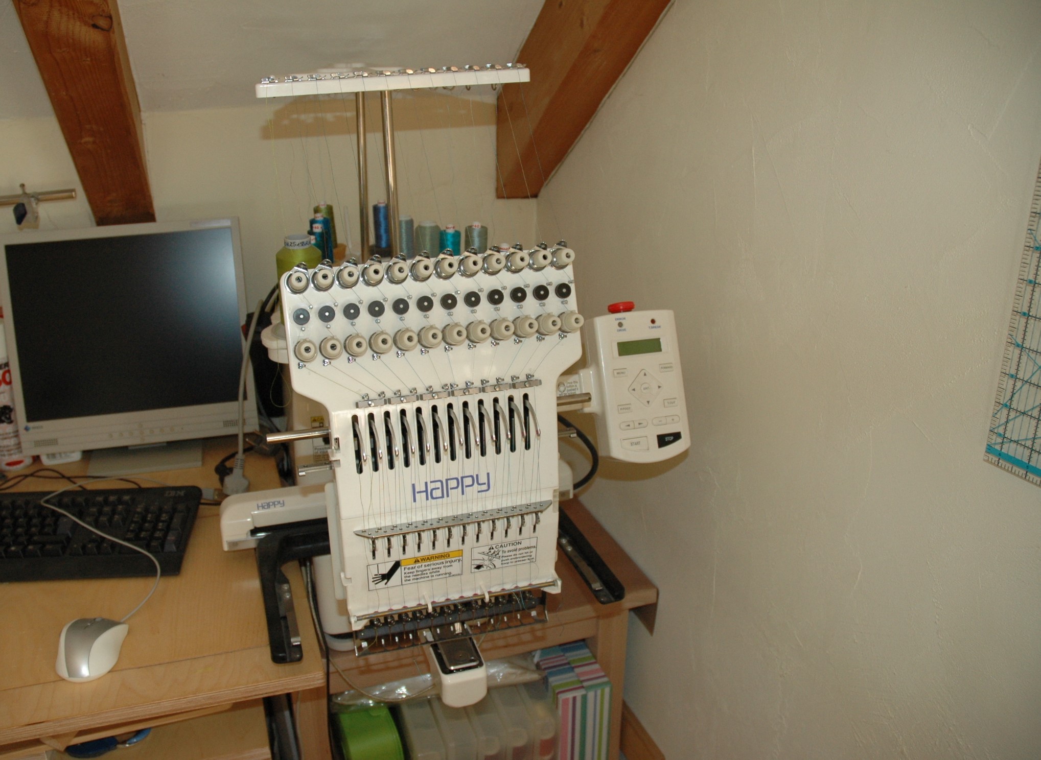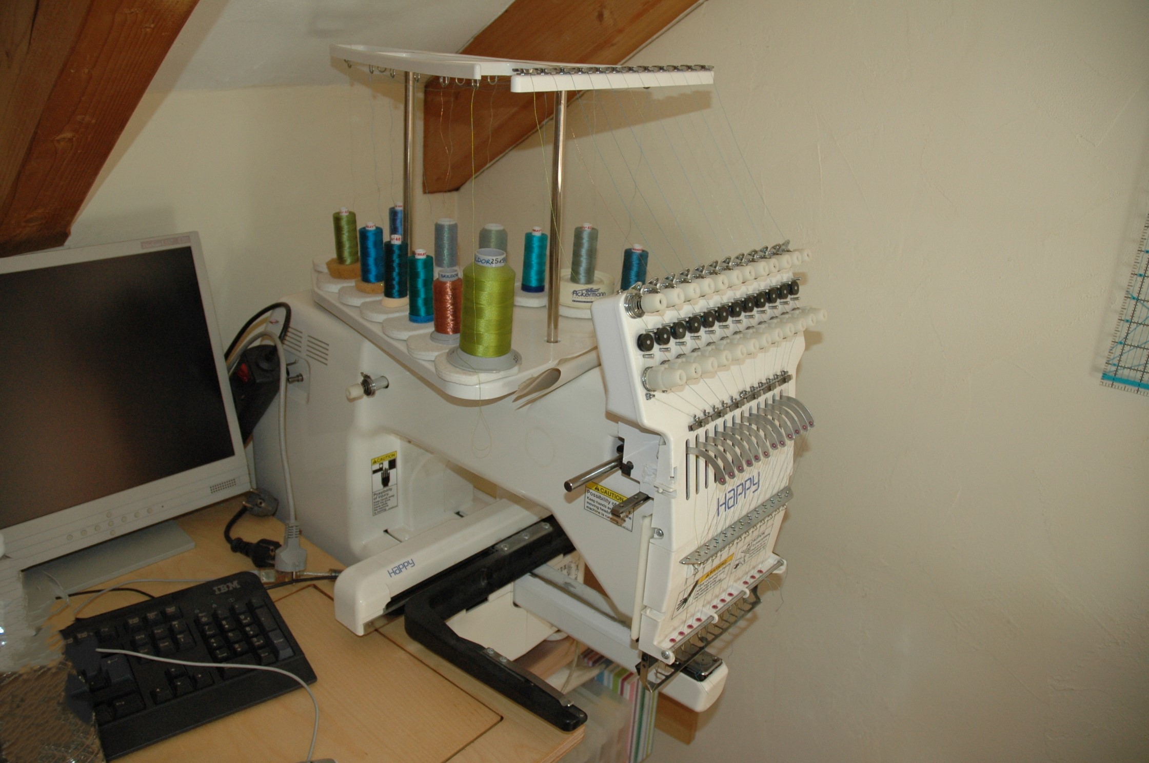 Die Stickmaschine hat einen Stickkopf mit 12 Nadeln! Die erleichtern das Sticken ungemein, da zuerst die Maschine mit Garn bestückt wird und dann die Farben automatisch wechselt und stickt.