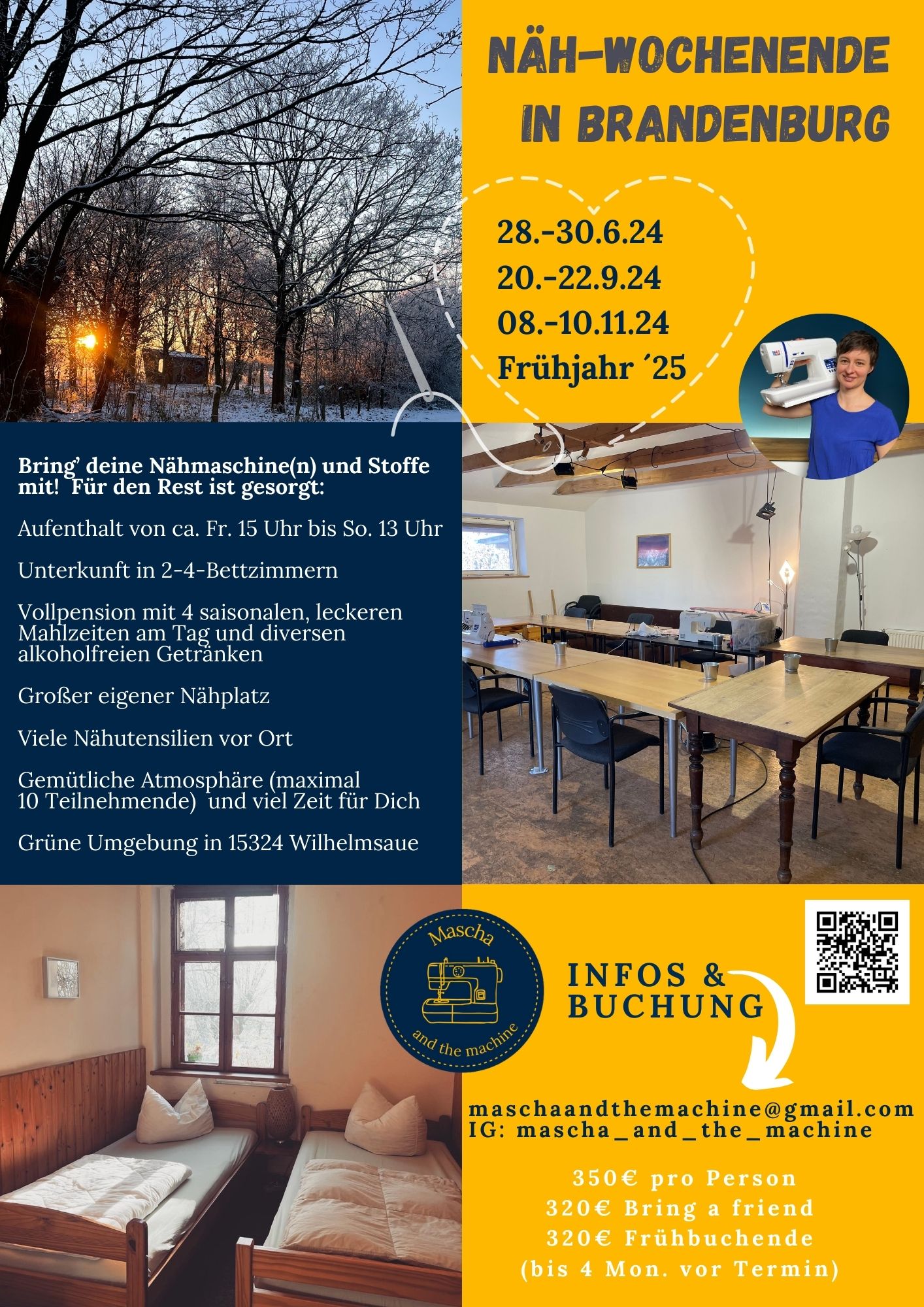 Kosten 350€ inklusive Übernachtung, Vollverpflegung, Getränken, Teilnahmegebühr und eine Nähüberraschung von mir.