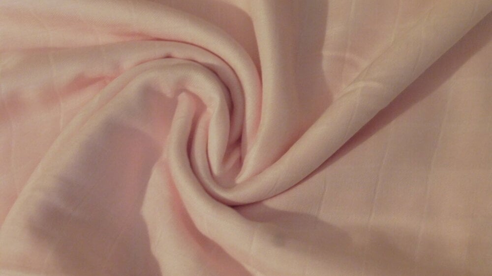 Double Gauze aus 100 % Bambus, zieht sich nach dem Waschen nur wenig zusammen, Struktur wirkt leicht kariert. Farbe blasses Rosa - schwer zu fotografieren, nicht ganz so blass wie am Foto aber eben nicht kräftig rosa.