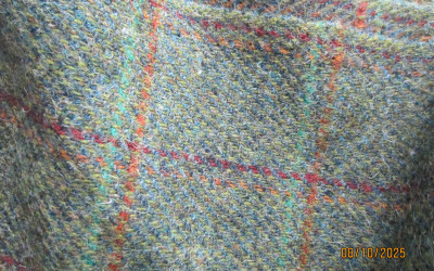 Harris Tweed, schwerer, handwerklich gewobener Tweed aus garngefärbter Wolle in typischem schottischen Karo rot in Grundfarbe Grün.