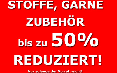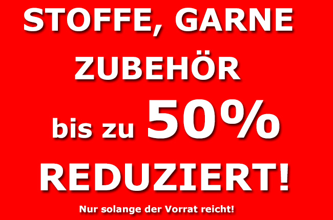 Stoffe, Garne und Zubehör jetzt zu Schnäppchenpreisen! Reißverschluß-Sortimente, Klemmschließen, Rollschneider, Scheren, Weihnachtsstoffe, Halloween-Stoffe und vieles mehr...bis zu 50% REDUZIERT! Nur solange der Vorrat reicht.