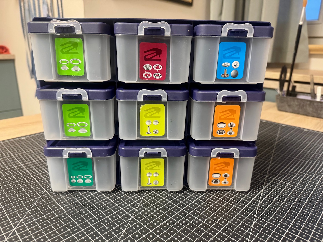 Die Boxen sind auf einer Seite mit PRYM-Aufkleber versehen, auf der anderen Seite, bis auf eine, sind die Boxen unbeklebt. Ich glaube, die Etiketten lassen sich mit Hilfe eines Föns auch wieder abziehen. Probiert habe ich das aber nicht. Boxen sind ohne Inhalt.