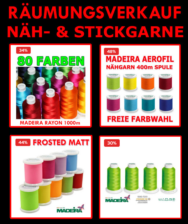 Näh-, Stick, und Overlockgarne: Viele Garnfarben sind bereits jetzt schon ausverkauft. Falls Ihr noch spezielle Farbwünsche habt, empfehlen wir Euch - bei den hohen Rabatten - nicht mehr allzu lange warten ![]()