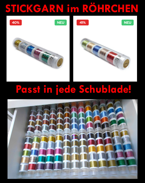 Fünf Spulen Madeira Stickgarn in einem transparenten Röhrchen. Die Röhrchen passen in jede Schublade, die Garne sind dabei vor Staub geschützt und Ihr seht auf Anhieb wo sich welche Farbe befindet. Das ist doch echt genial 😉