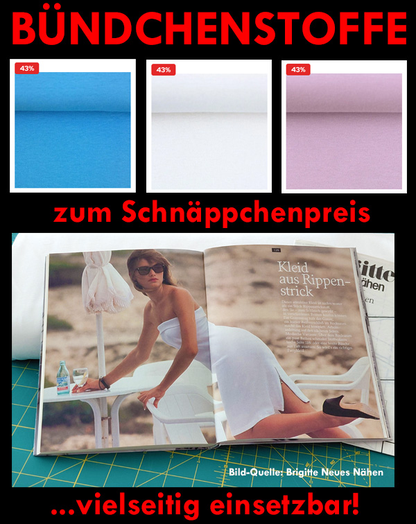 Bündchenstoffe eignen sich nicht nur für Bündchen an Shirts, Ihr könnt Euch aus dem rundgestrickten Stoff auch superleicht und schnell ein Urlaubs-Outfit nähen. Ob Kleid, Rock oder Top. Einfach oben und unten umsäumen, ein Gummiband durchziehen - fertig! Wer mag veredelt das Ganze noch mit einem Schlitz oder einem Reißverschluß am Saum. Die Länge bestimmt Ihr selber, so wie es am Besten gefällt!