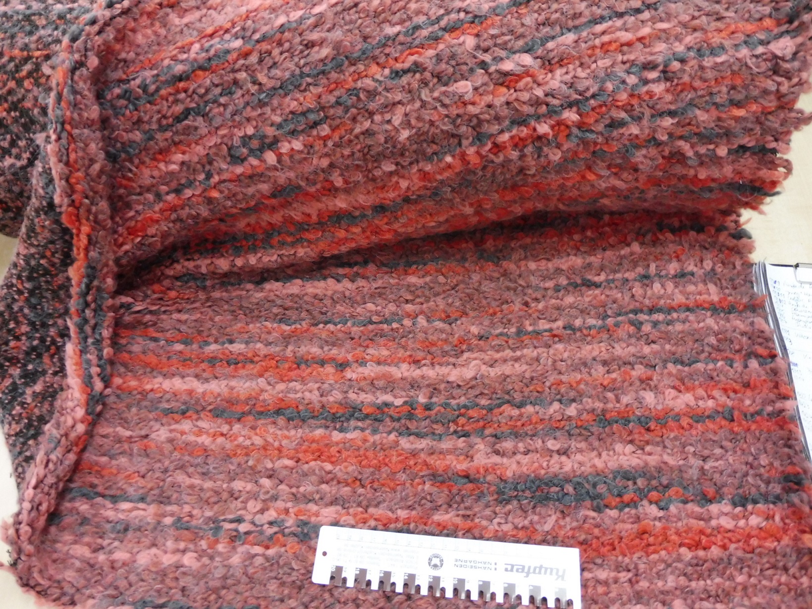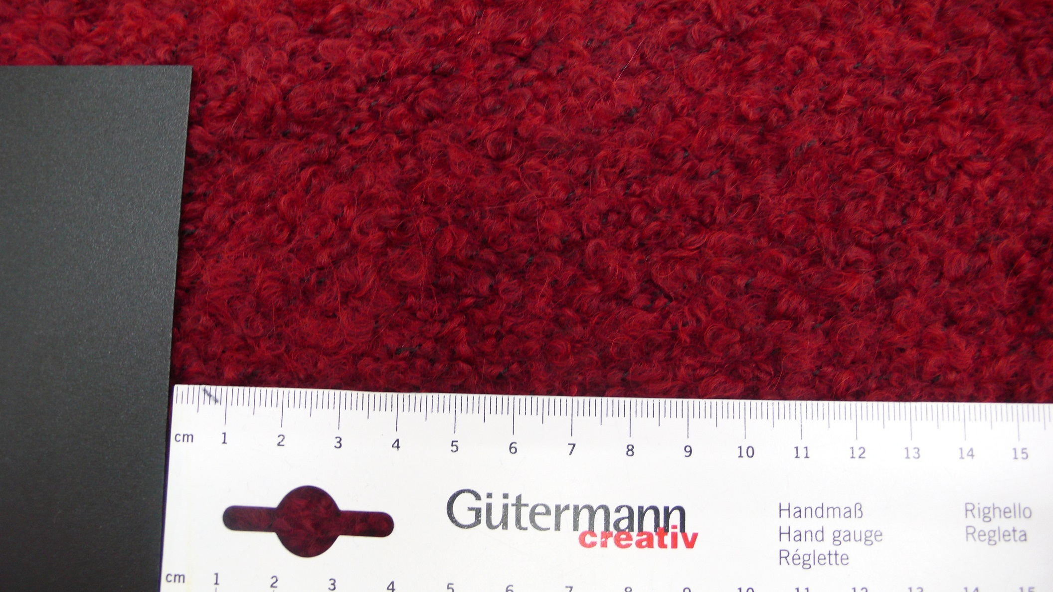 Wollboucle dunkelrot, 51 % Wolle, 24 % Polyacryl, 12 % Polyester, 11 % Polyamid, 2 % Elasthan, ca. 145 cm breit, 3 m, Meterpreis 18,- € oder Gesamtpreis 45,- € (vorher 36,-€ / m) 30 Grad Schonwäsche