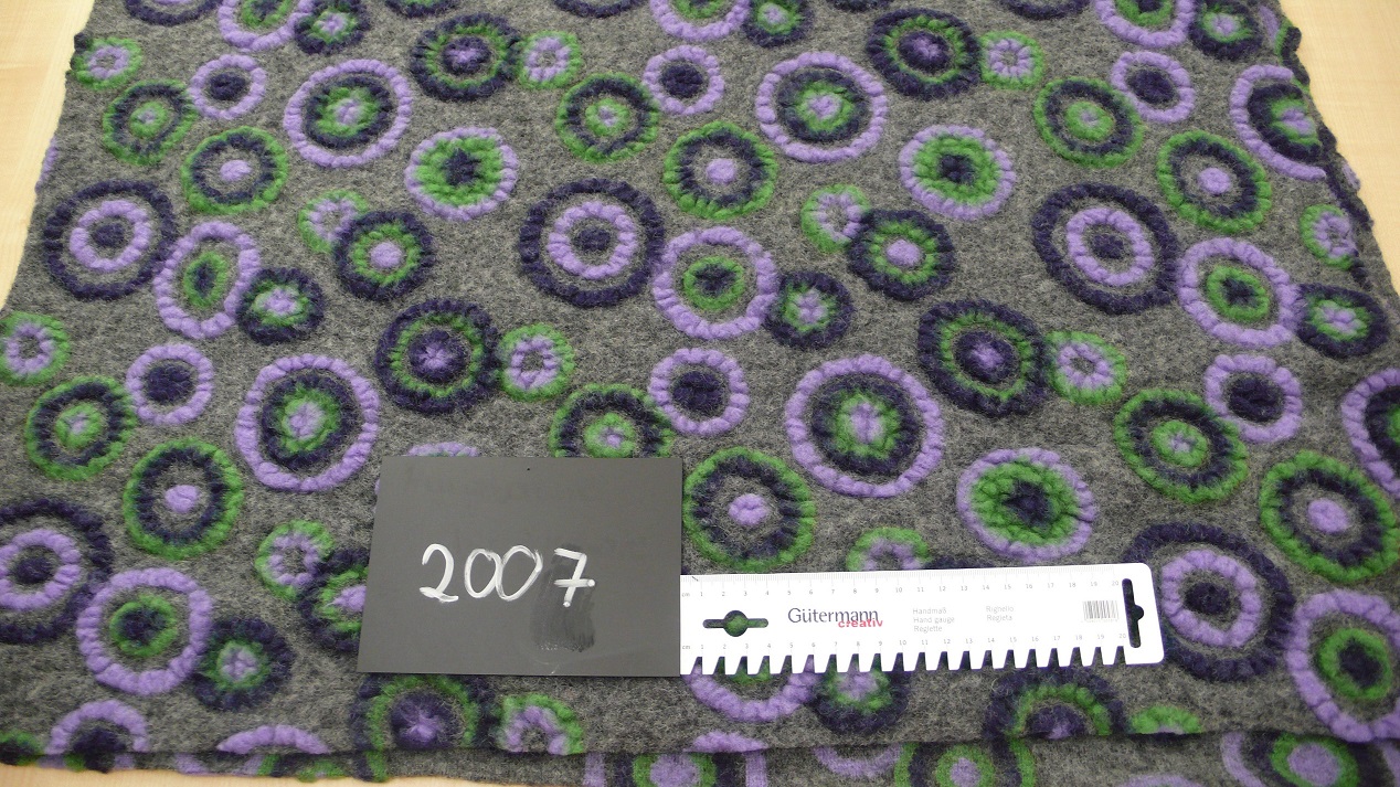 Walkstrick mit Kreisen grau-grün-lila-violett, 80 % Schurwolle, 20 % Baumwolle, ca. 140 cm breit, 2,90 m, Meterpreis 22,- € oder Gesamtpreis 55,-€ (vorher 44,-€ / m)