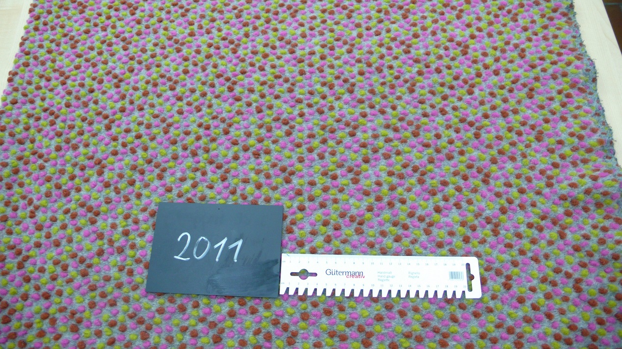Wollwalk mit bunten Noppen, grau-lemongrün-rost-pink, 80 % Schurwolle, 20 % Baumwolle, ca. 140 cm breit, ca. 3,10 m, Meterpreis 22,- € oder Gesamtpreis 59,-€ (vorher 44,-€ / m)