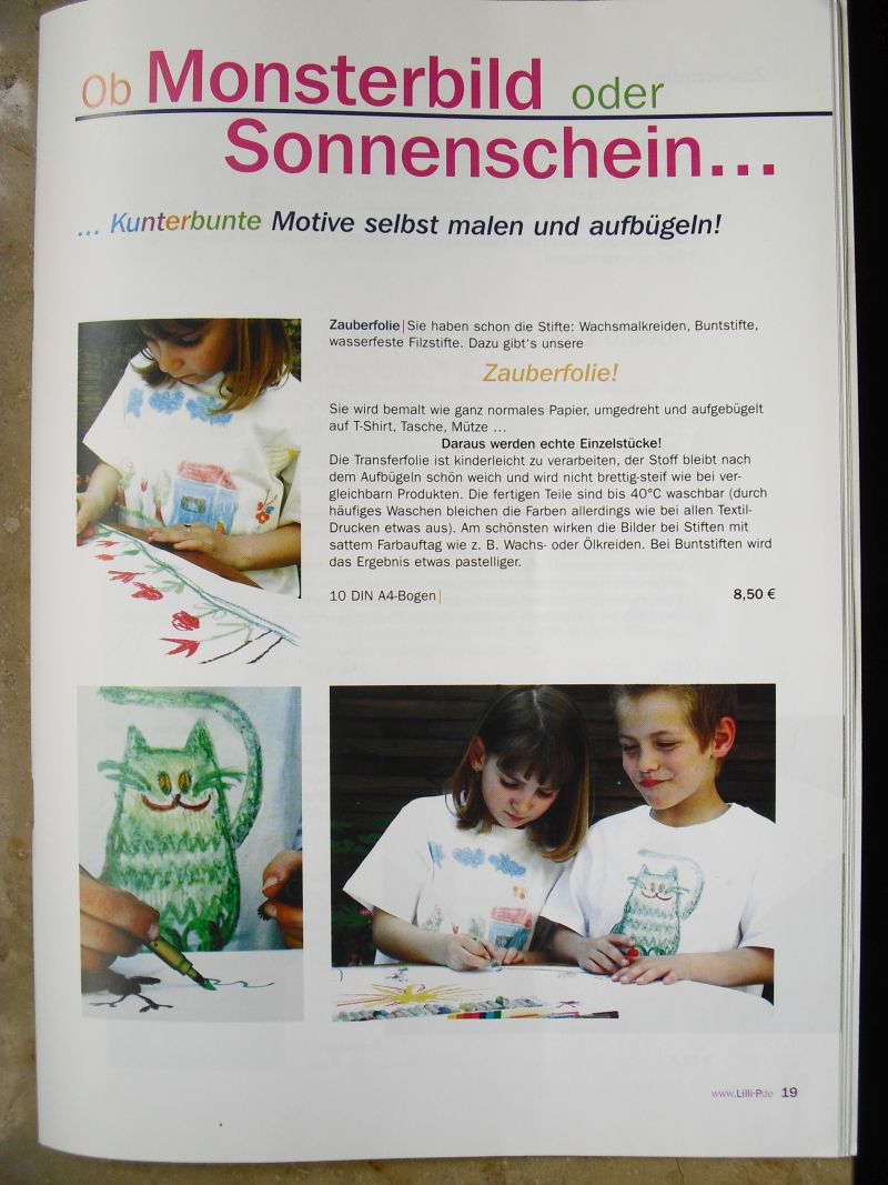 `Zauberfolie´: sie wird bemalt wie ganz normales Papier, umgedreht und aufgebügelt auf T-Shirt, Tasche, Mütze...Die Transferfolie ist kinderleicht zu verarbeiten, der Stoff bleibt nach dem Aufbügeln schön weich. Die fertigen Teile sind bis 40 ° waschbar. Am schönsten wirken die Bilder bei Stiften mit sattem Farbauftrag wie z.B. Wachs- oder Ölkreiden. Bei Buntstiften wird das Ergebnis etwas pastelliger.
