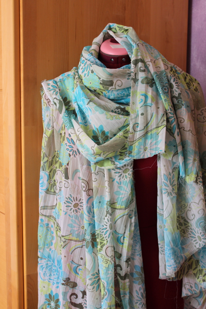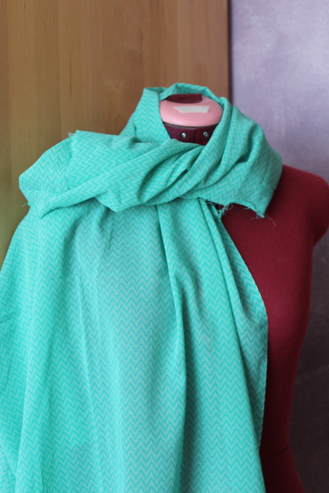 - dünner türkiser Zickzack-Stoff, transparent, (ich habe daraus einen unterfütterten Rock genäht), Kunstfaser, 132 x 110 cm